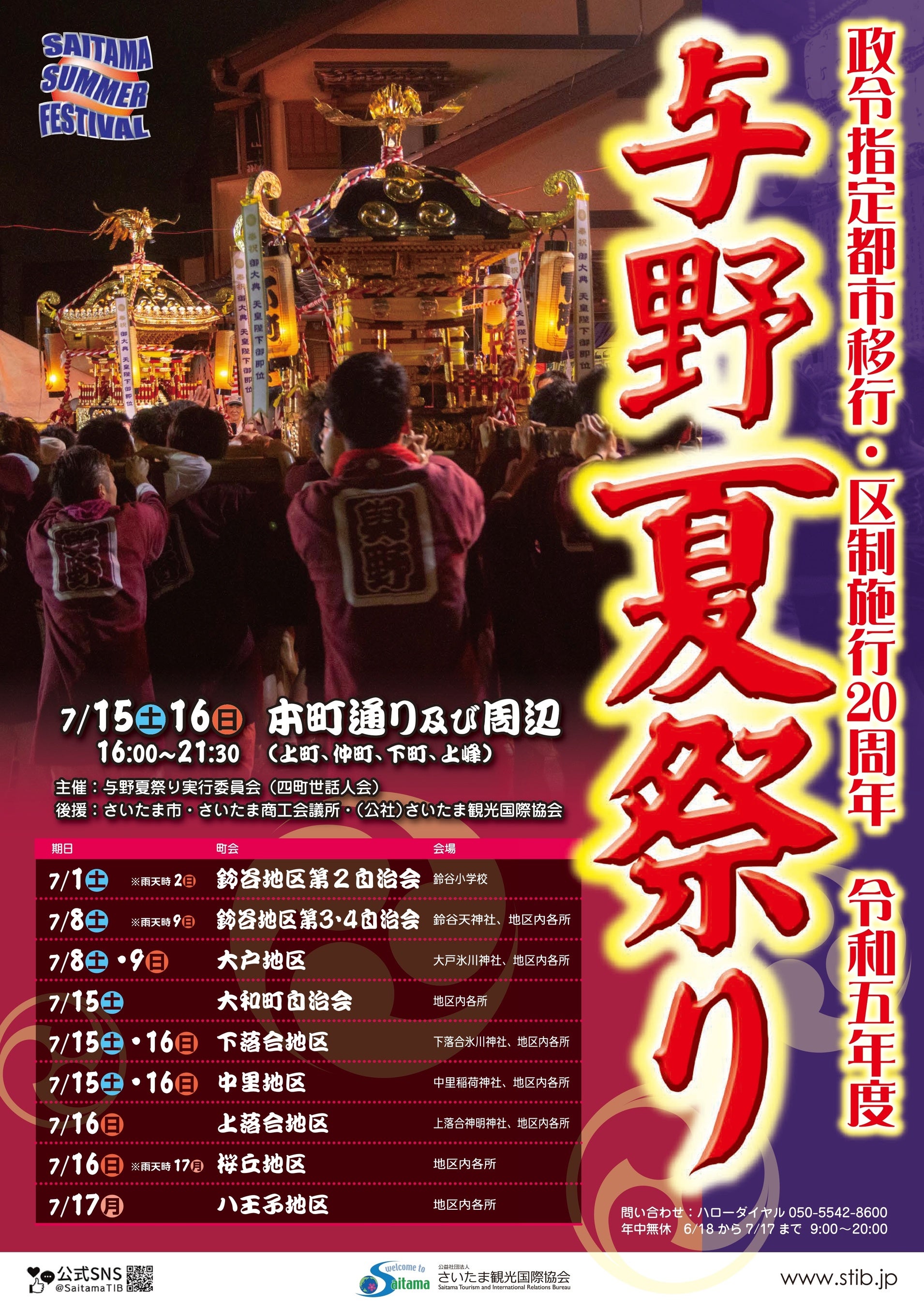 4年ぶりに与野本町通り周辺で開催される、宝永年間(1704〜1711年)から続いていると言われる歴史ある祭り。7月15日(土)・16日(日)の2日間で、上町、仲町、下町、上峰地区の御輿が、1日目は揃いで、2日目はそれぞれ会場周辺を渡御します。