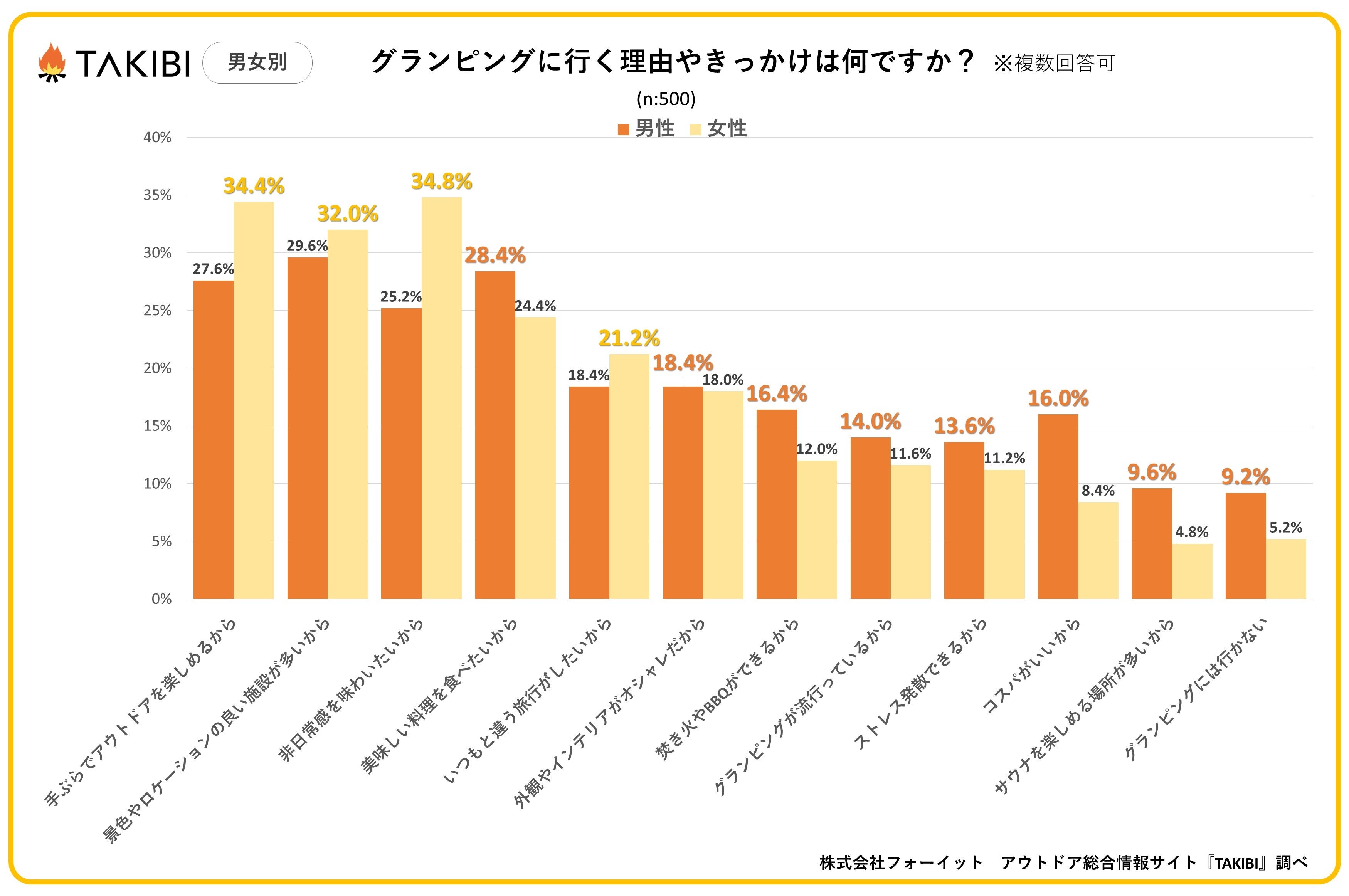 男女別に見ると、女性では、「手ぶらでアウトドアを楽しめるから」「景色やロケーションの良い施設が多いから」「非日常感を味わいたいから」などの”アウトドア要素”のある項目の回答率が特に高くなっているのに対し、男性では「美味しいご飯を食べたいから」「コスパがいいから」「サウナを楽しめる場所が多いから」など、宿泊先で”できること”に関する項目の回答率が高くなりました。