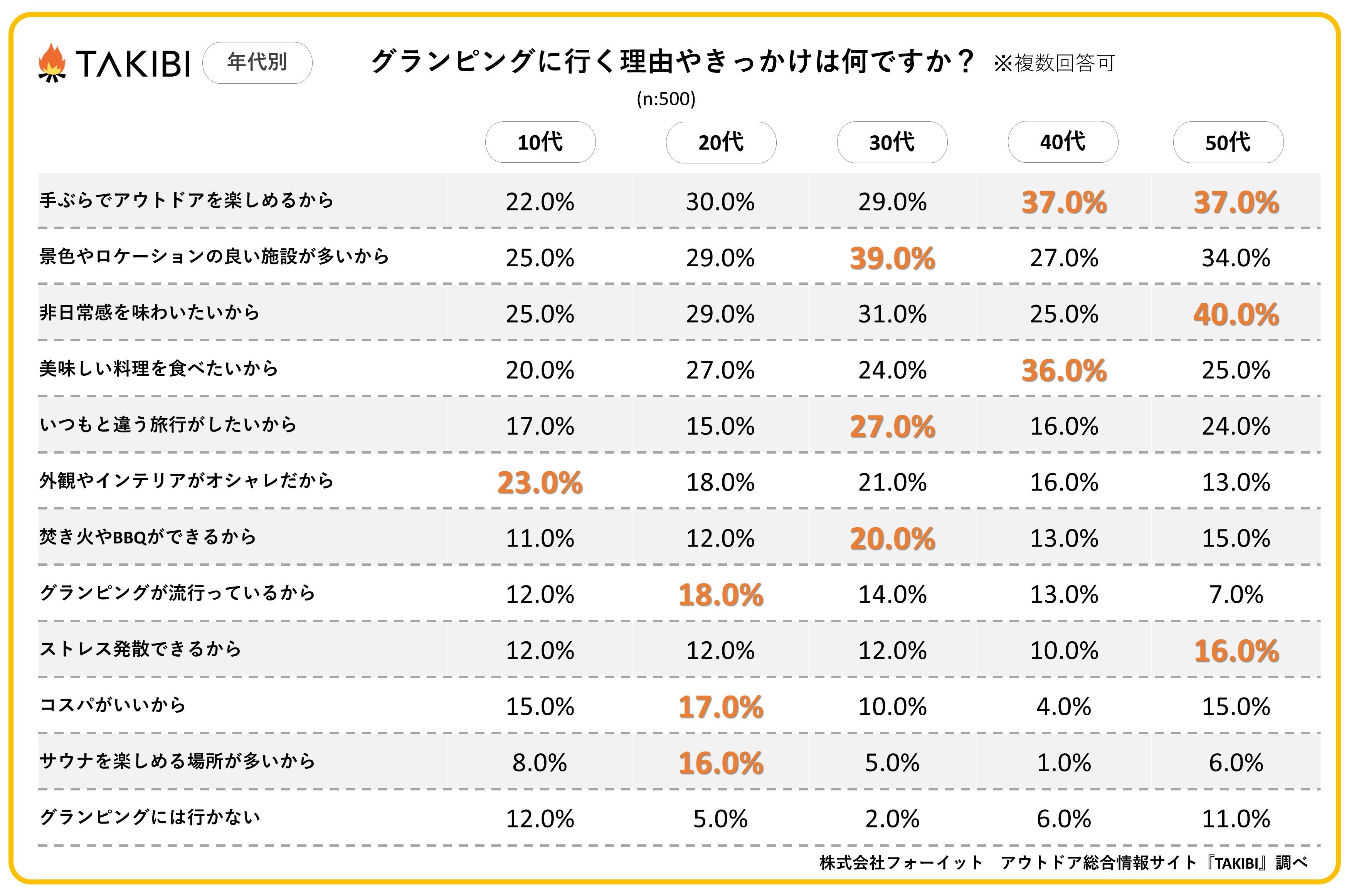 キャンプやグランピングを中心としたアウトドア総合情報サイト「TAKIBI」の運営をおこなう株式会社フォーイットは、全国の10代~50代までの男女500人を対象にグランピングの予算に関するアンケートを実施し、男女別・年代別等の特徴についてまとめました。