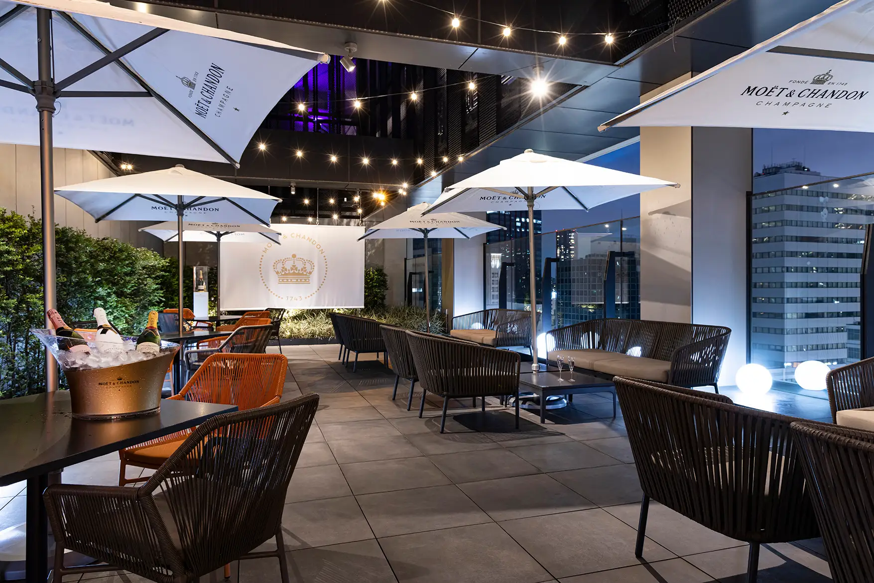 プルマン東京田町の9階に位置する、屋上の賑やかなバー。9番線を意味するPLATFORM9はその名の通り、東京を取り囲むように走る山手線へのオマージュ。人々が行き交う駅の様に賑わう出会いと交流の場として、お気軽にお越しください。8月31日までモエ・エ・シャンドンとコラボレーションしたシャンパンガーデンを開催中。