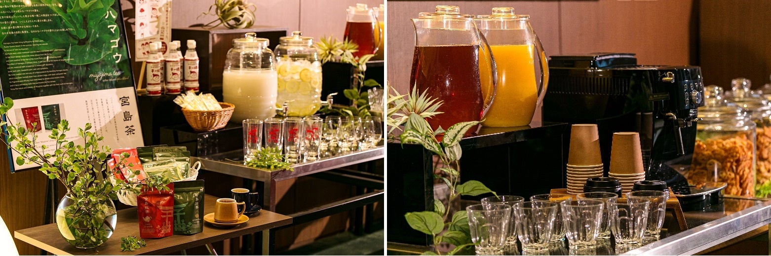 「ハマゴウ」をブレントした宮島紅茶・宮島緑茶、チチヤスのチー坊、広島産のフレッシュな柑橘類などを使用したデトックスウォーター、コーヒーマシーンによる挽きたてのコーヒー、オレンジジュース、ウーロン茶。