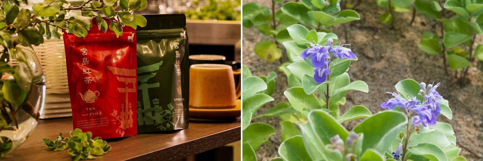宮島や廿日市市の海岸に自生する海浜植物ハマゴウ(浜香)は、夏に紫色の小さな花を咲かせ、その爽やかな香りが特徴の植物です。平安時代の貴族たちに安眠を誘うアロマとして楽しまれ、平安時代末期の平清盛の時代には果実や茎葉は生薬や虫除け、薬湯としても親しまれていました。ハマゴウは薬湯にすると肩こりや腰痛、頭痛や風邪の症状を和らげる効果が期待されています。いにしえより広島の地に根付くハマゴウをブレンドした紅茶・緑茶は五感に染み渡る爽やかな味わいで、そのほのかな香りが広島の自然と美しい風景を思い起こさせます。