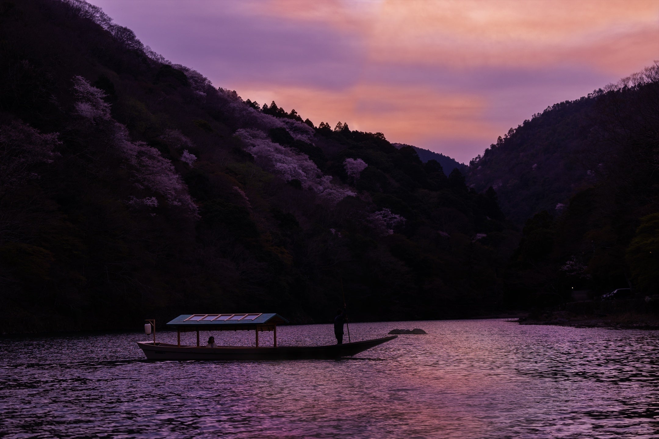 枕草子に「秋は、夕暮れ*2」とあるように、古くから秋の夕暮れは格別に美しいとされてきました。日が落ち始める黄昏時に星のや京都の目の前の大堰川(おおいがわ)に屋形舟を浮かべ、空の色があたたかな赤から、紫や紺の深い色へとドラマチックに変わる様子を愛でながら、月が出るのを優雅に楽しみます。