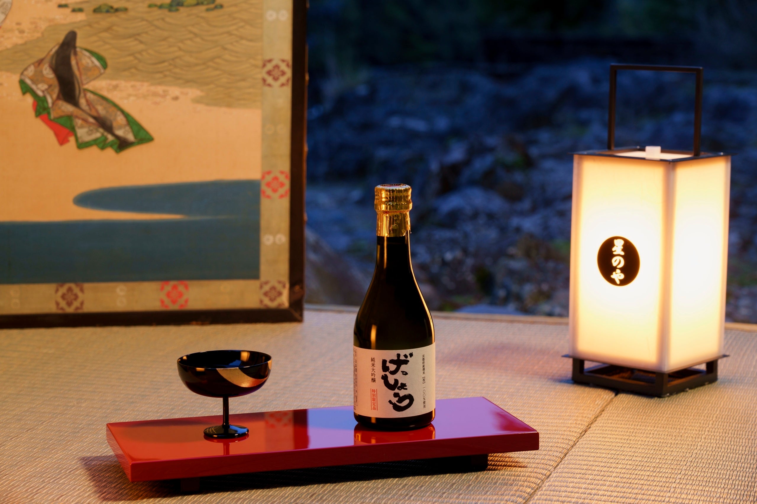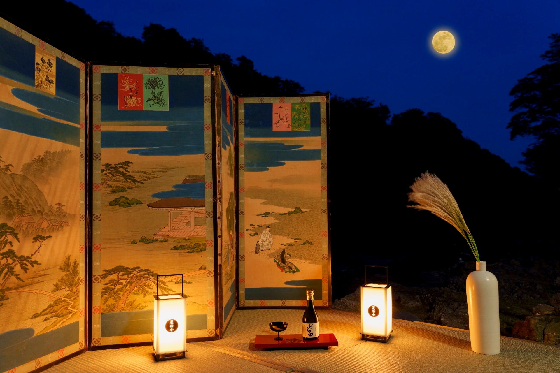 平安絵巻を彷彿とさせる屏風を設えた特別な空間で、心地よい秋風を感じながら、月にまつわる日本酒とともに観月に興じます。日本酒は、京都市嵯峨地域で栽培された酒米「祝(いわい)」でつくられた純米大吟醸酒「月賞(げっしょう)」で、平安貴族が嵐山の地で月を鑑賞しながら酒を酌み交わしていたことが由来です。
