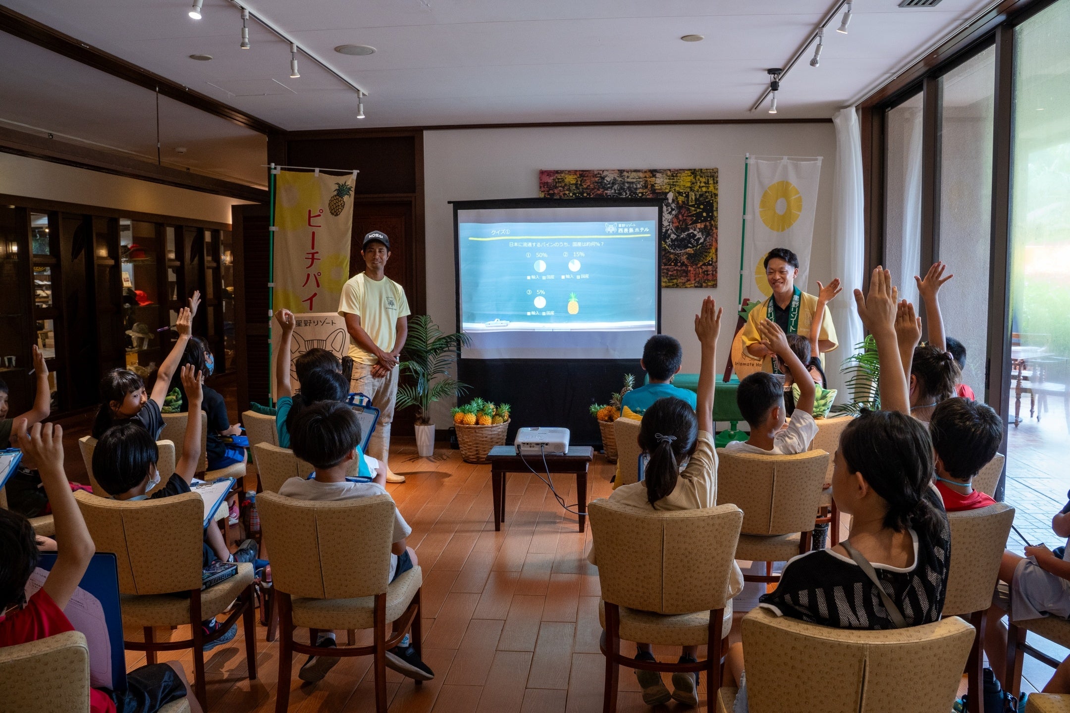 当日は、西表島にある上原小学校の4年生合わせて19名が参加しました。パイン農家さんによるピーチパインの美味しさのひみつの紹介や、「ピーチパイン」と異なる種のパインである「サンスイート」の食べ比べを通じて、楽しみながら西表島の特産品への理解を深めました。西表島トロピカルフルーツ生産組合の池村(いけむら)一輝(かずき)さんが、「地元の子どもたちと、農業についてかかわりあう機会が滅多にないので、直接お話できる機会はありがたかったです。」と語ったように、地元の小学生、パイン農家、ホテルスタッフという三者が直接交流する機会を提供しました。