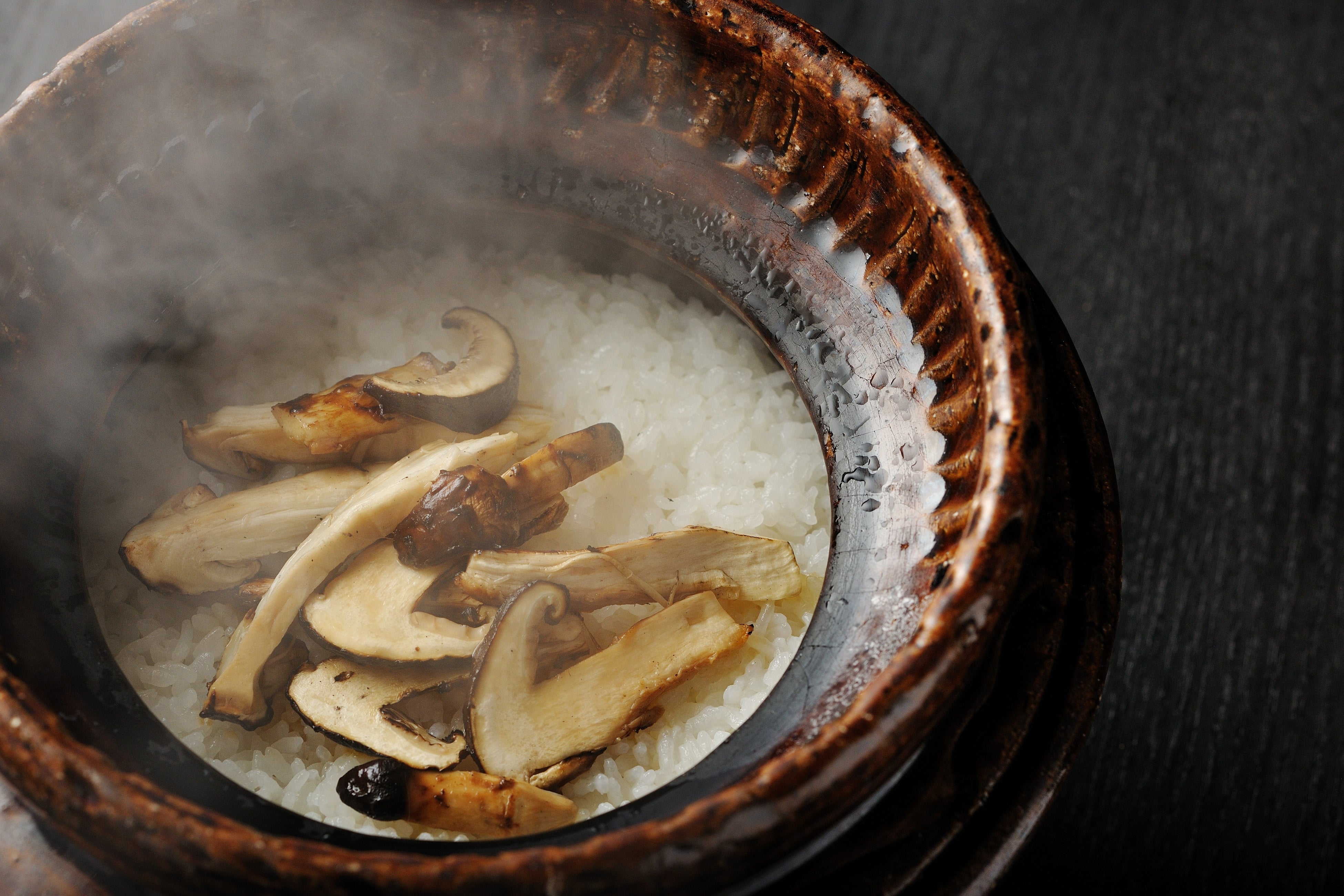 状態の良い松茸は、米と一緒に炊いてもその香りを損なうことはなく、それどころか松茸の旨味を米や出汁に十分に浸透させます。炊き上がりには、炭火で香ばしく焼き上げた松茸も乗せて提供することで、土鍋の蓋を開けた瞬間にふわりと立ち上る湯気から、香り高い豊かな風味も感じられます。松茸本来の香りや歯応え、旨味、その全てを最後まで十分に味わい尽くせる御飯です。