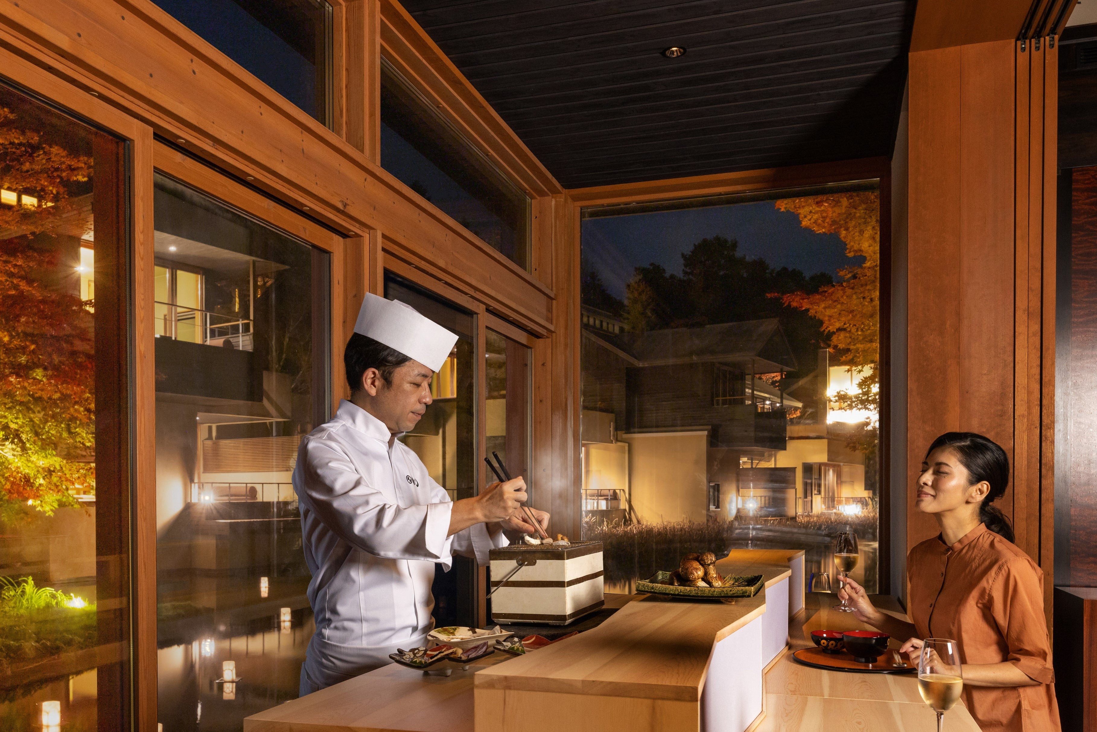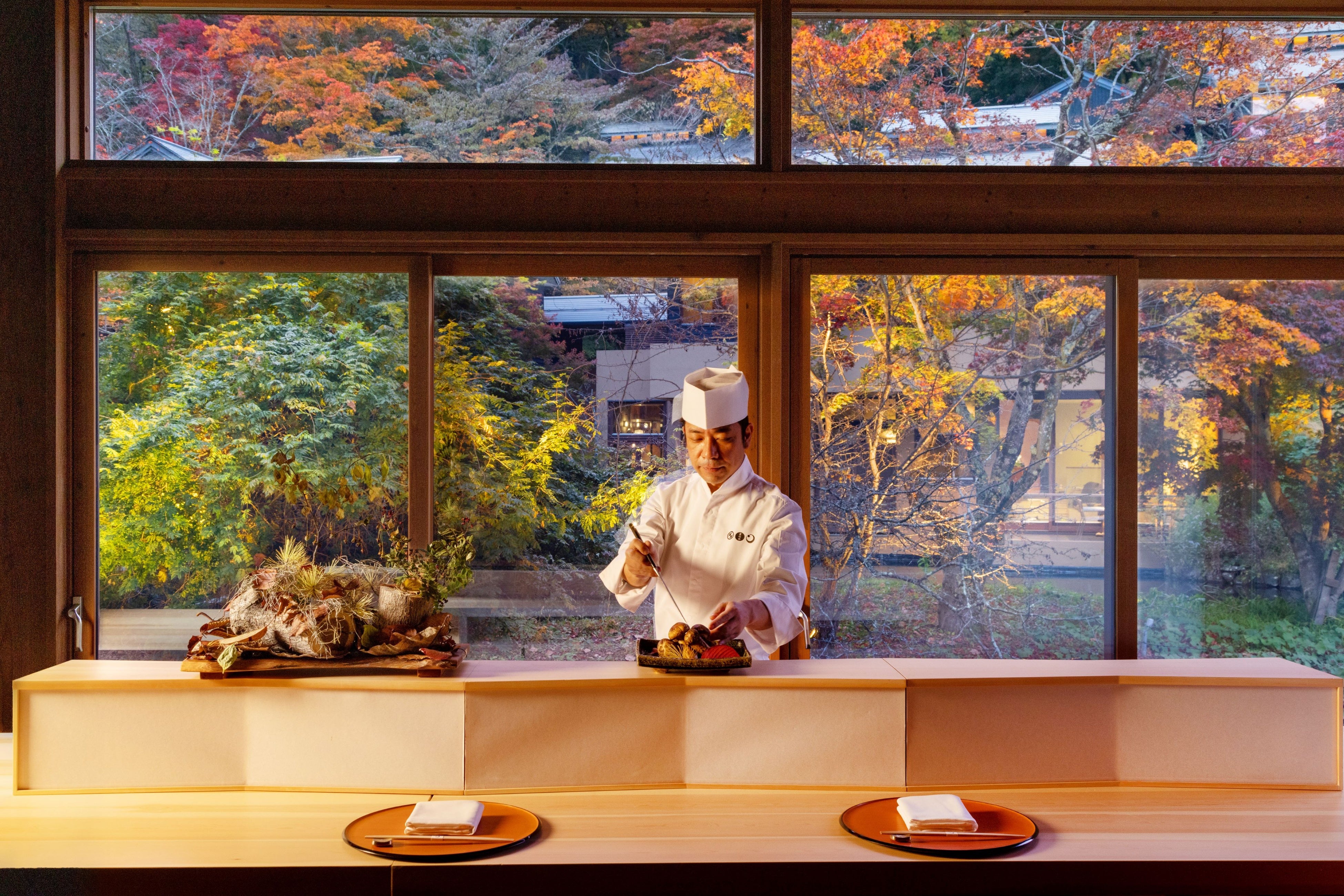 繊細な松茸の香りを存分に堪能できるよう、星のや軽井沢の敷地内にある戸建ての空間を一棟貸し切り、一日一組限定のカウンター席を設けます。窓の外に広がる鮮やかに色づき始めた紅葉を愛でながら、食事を楽しめる空間です。呼吸を整え、一棟貸し切りの空間に一歩踏み込むと、そこではまさに、松茸が生えている里山そのものの広がる香りを感じることができます。料理人が目の前で松茸を焼き上げて提供するため、松茸の芳醇な香りを直に感じることができ、より一層奥深い優雅な食体験になります。