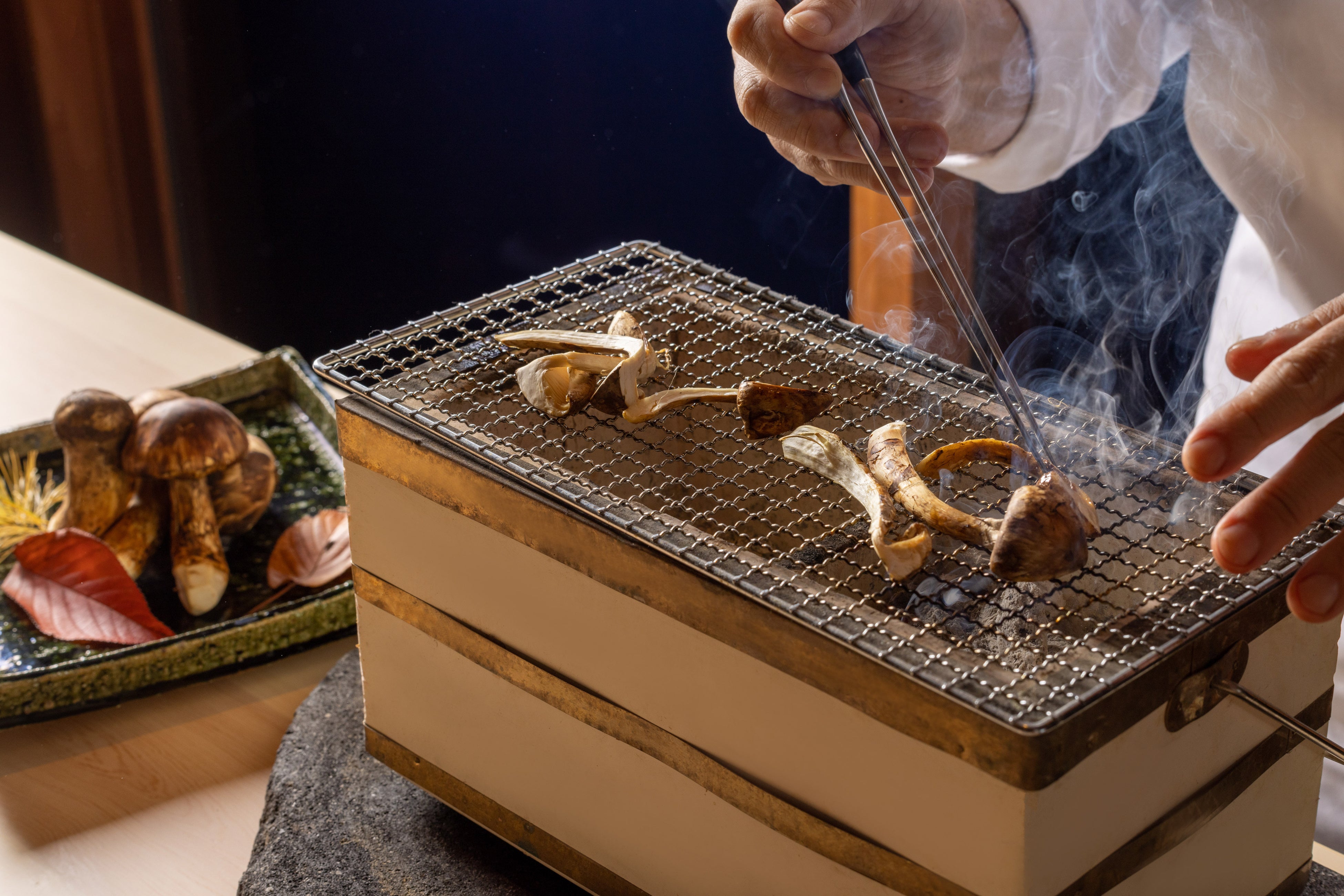 山林に恵まれた信州は、全国有数の松茸の産地で、生産量は毎年全国上位(*)に入ります。雨量や気温・湿度などの自然環境の条件が揃わない限り姿を現すことのない松茸ですが、丁寧に管理された良質なアカマツ林で育った松茸は、火を通さずとも感じられる上質で圧倒的な香りがあります。また、炭火で丁寧に焼き上げられた松茸からはより一層芳醇な香りを感じることができ、しっかりとした歯応えや素材本来の旨味も堪能できます。都内より一足早く色づき始める紅葉を愛でながら、厳選された香り高い松茸を味わい尽くす食体験を届けたいという思いから、特別な夕食を提供します。