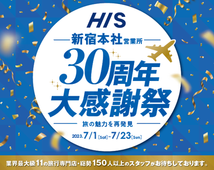 この度、HIS新宿本社営業所のオープン30周年を記念して、「旅の魅力を再発見」をテーマに、ご愛顧いただきました皆様へ向けて感謝祭を開催いたします。