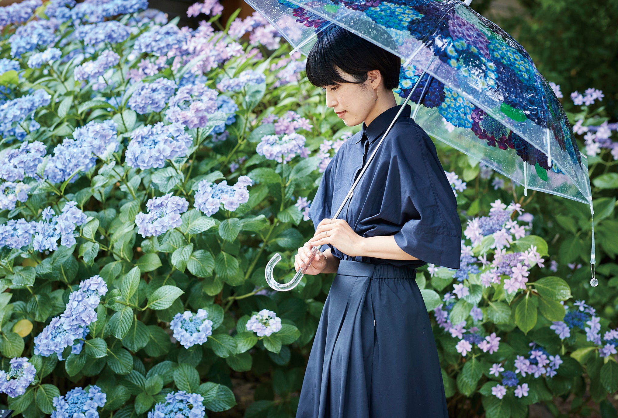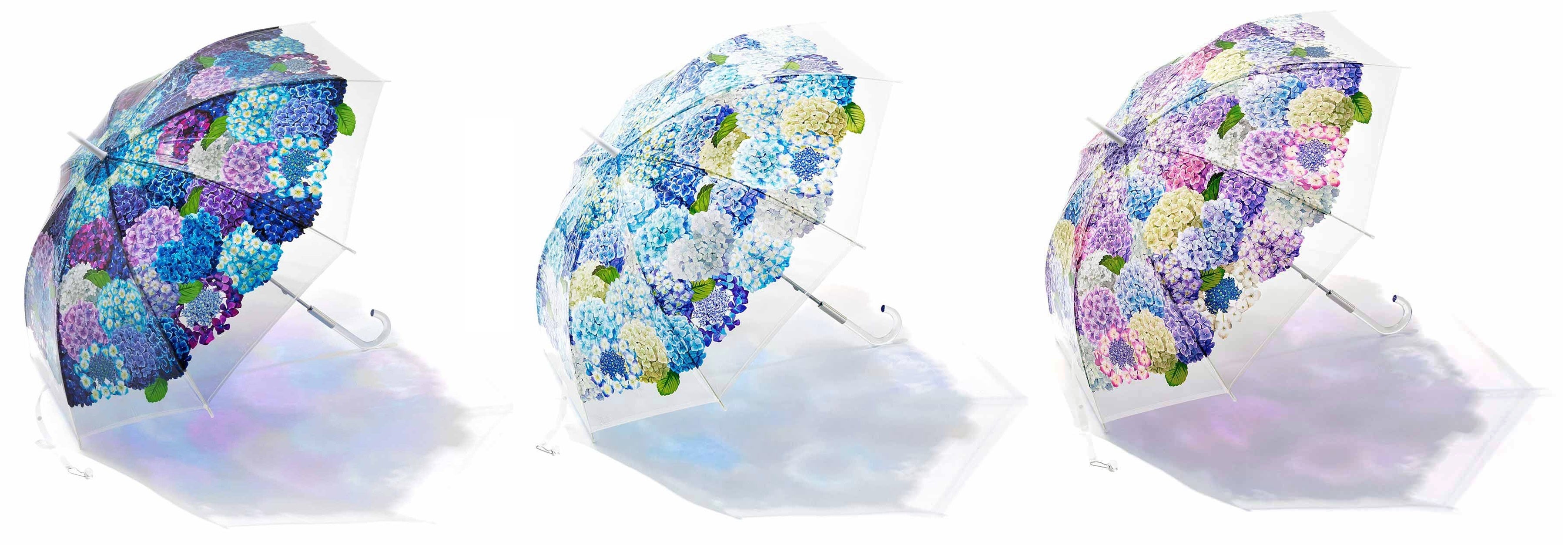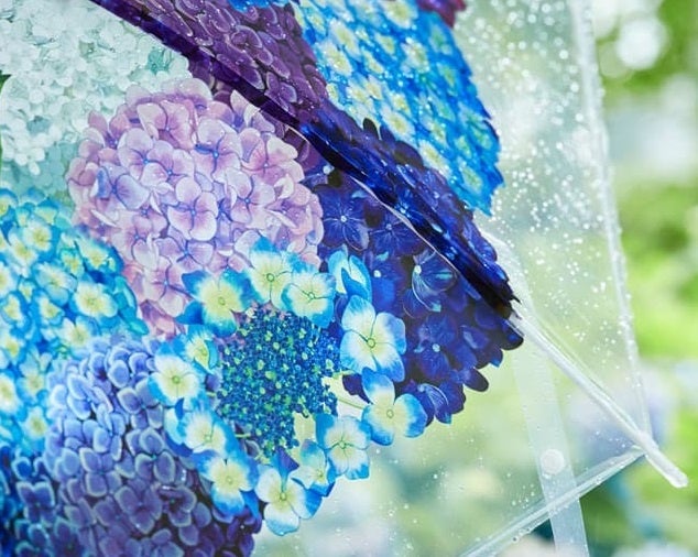 雨の日を美しいグラデーションで彩る紫陽花を、空いっぱいに広げて思う存分堪能できる傘です。繊細で、ていねいに描かれた紫陽花のリアルなイラストを透明傘にのせているので、外から見れば紫陽花の花束のよう。内側から見上げれば、まるで紫陽花が空から咲きこぼれてくるような気分が味わえます。