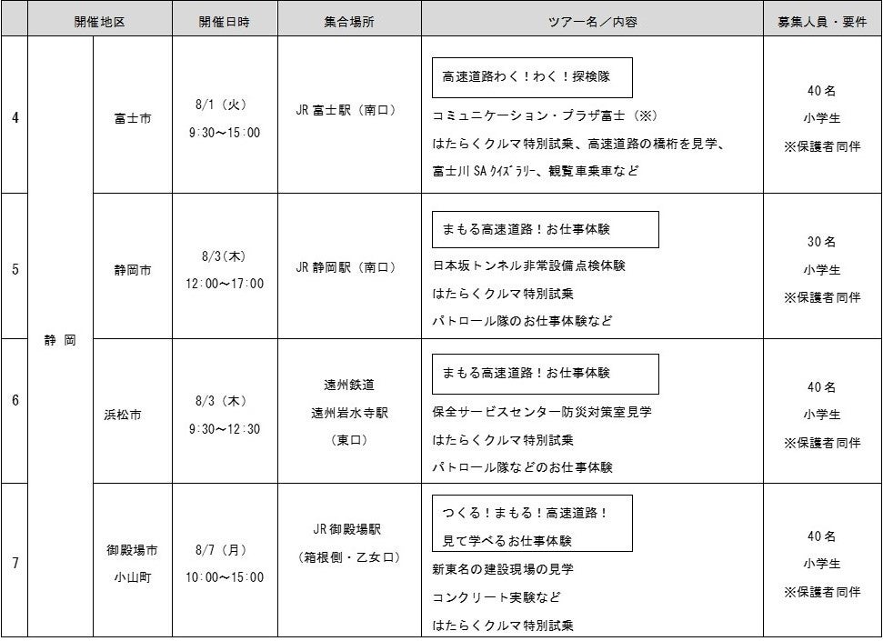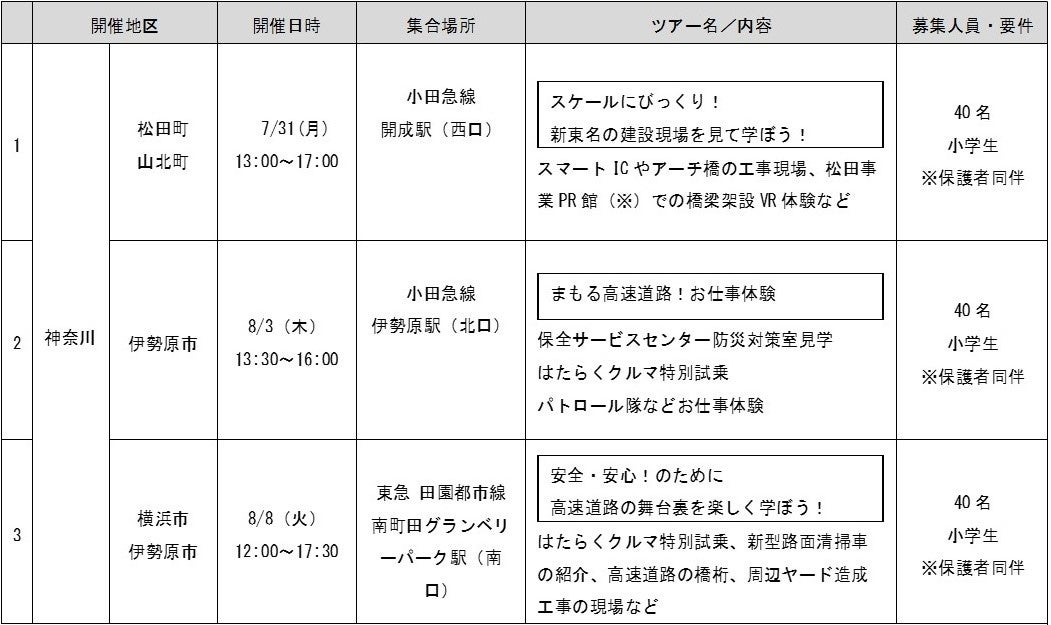 NEXCO中日本 東京支社(東京都港区、支社長・松井 保幸)は、子どもたちに高速道路を身近に感じてもらうため、夏休み親子見学会「ハイウェイみて!みて!ツアーズ」を、7月31日を皮切りに神奈川県と静岡県の全7地区で開催します。