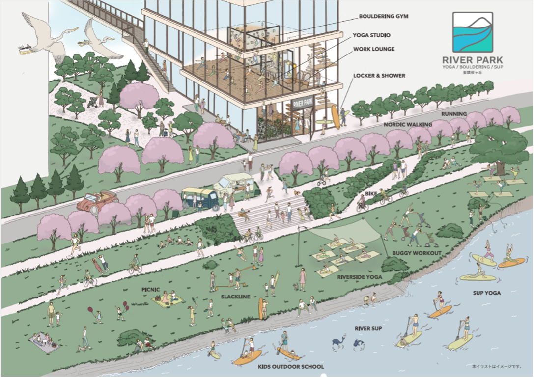 本事業は、聖蹟桜ヶ丘駅から徒歩5分の立地に開業予定の商業施設「サクテラスモール」で、多摩川を活用したリバーSUP、屋内施設でヨガスタジオ・ボルダリングなど複合的な会員制アウトドアフィットネス事業を展開するものです。