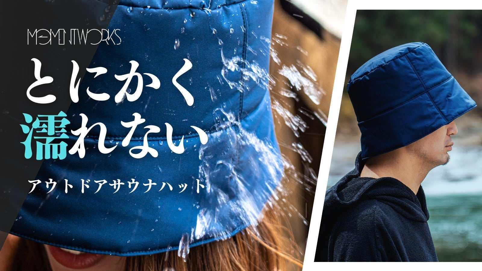 アウトドアサウナハットが解決する課題 従来型のサウナハットはその多くがタオル生地を採用しています。タオル生地は肌触りが良いものの、サウナで利用する場合は汗を吸い込み水滴が首元に滴ってしまうという不快感がありました。 Moment Worksのサウナハットは、アウトドア用品で使われる高品質の撥水素材を使うことで、「とにかく濡れない」ので、こういった不快感から開放されます。