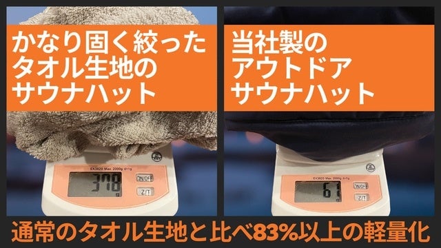 撥水性の高い素材を採用したことで、従来型のタオル生地のサウナハットと比べ、1度使用したあとの重量が83%以上軽くなりました。