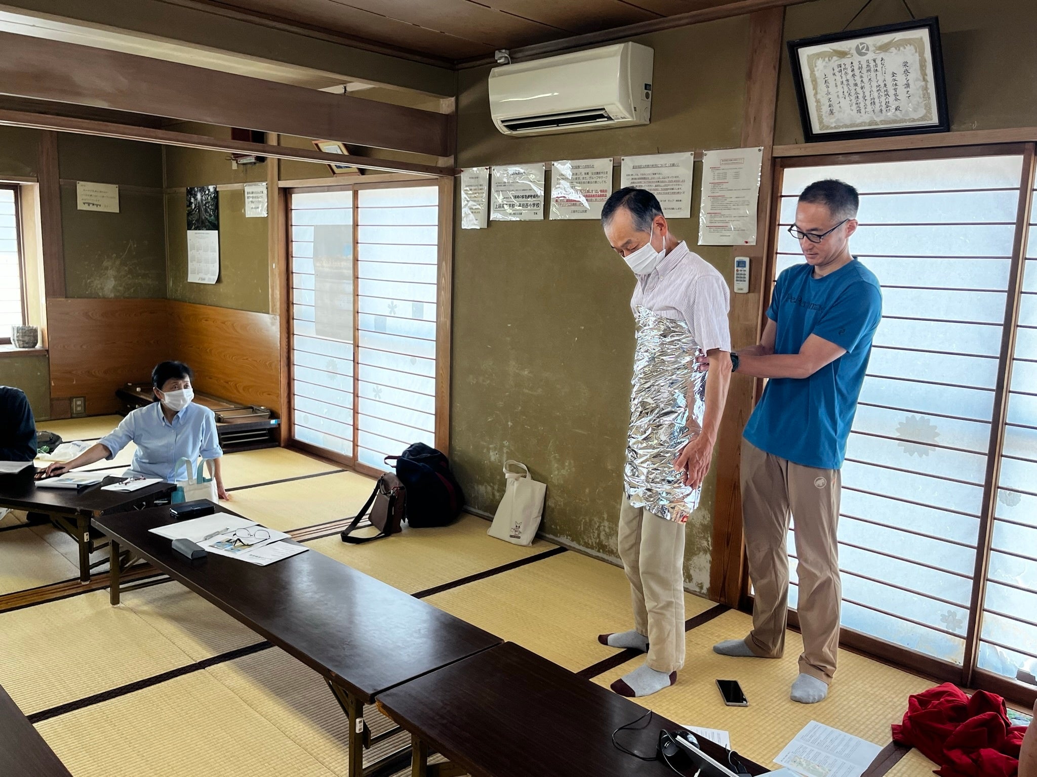 デッドエアーとは「動かない空気」のことで、衣類の中に温かい空気の層をつくることが保温効果を高めるのに有効であること。夏山でも低体温症の危険性があり、そのためには肌を濡らさないこと、体の熱を逃さないことが重要であることをエマージェンシーシートの活用と共に紹介しました。