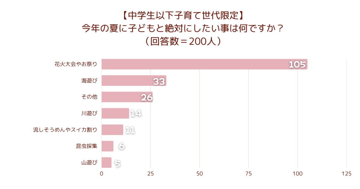 「【中学生以下子育て世代限定】今年の夏に子どもと絶対にしたい事は何ですか?」とアンケート調査した結果、1位は『花火大会やお祭り』でした。