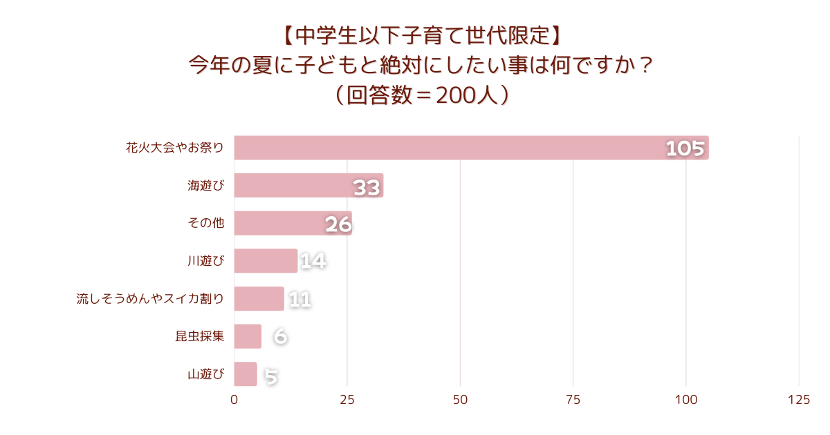 「【中学生以下子育て世代限定】今年の夏に子どもと絶対にしたい事は何ですか?」とアンケート調査した結果、1位は『花火大会やお祭り』でした。