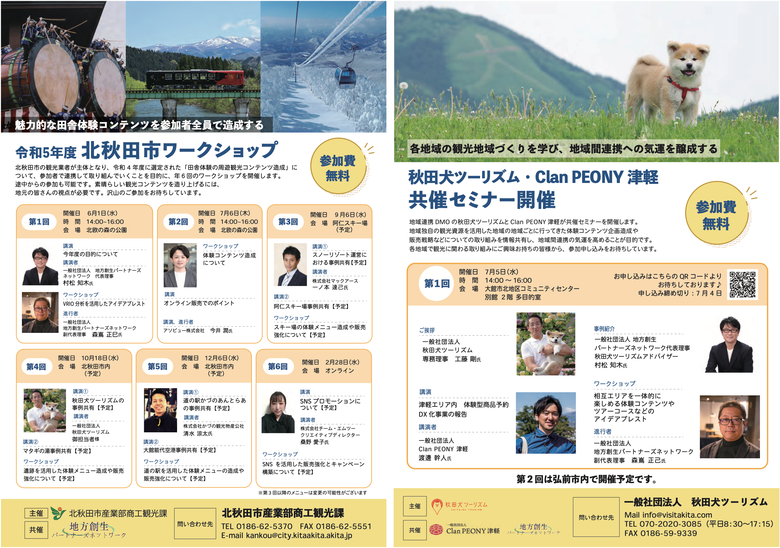(一社)秋田犬ツーリズム(秋田県大館市/代表理事:吉原 秀吉)は(一社)Clan PEONY津軽(青森県弘前市/理事長:櫻田 宏)との共催で7月5日、続く7月6日に北秋田市産業部商工観光課は、 (一社)地⽅創⽣パートナーズネットワーク(東京都渋⾕区/代表理事:村松 知⽊)と共に体験型観光コンテンツ造成に関するセミナー・ワークショップを実施いたします。