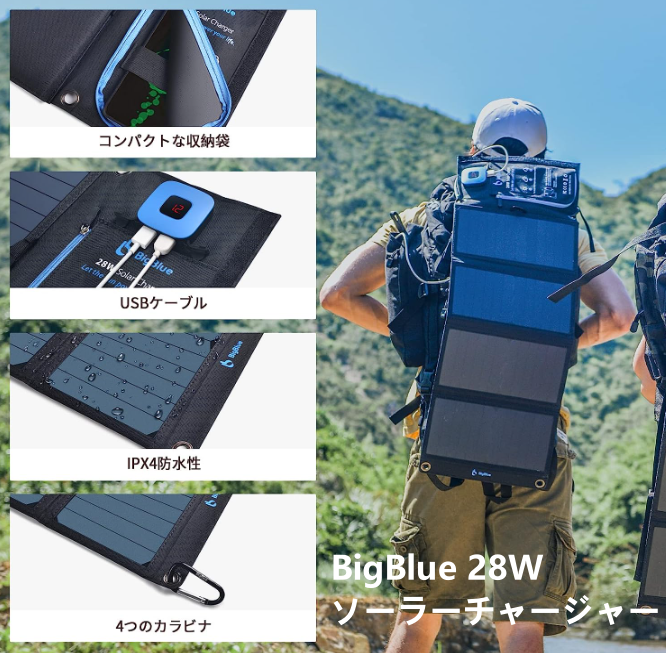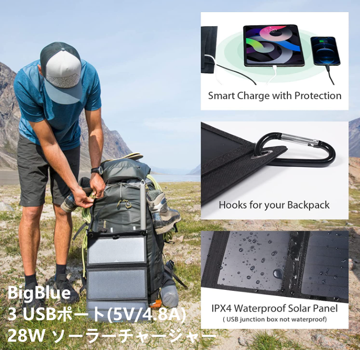 ◆BigBlue 28W ソーラーチャージャー3 USBポート(5V/4.8A)