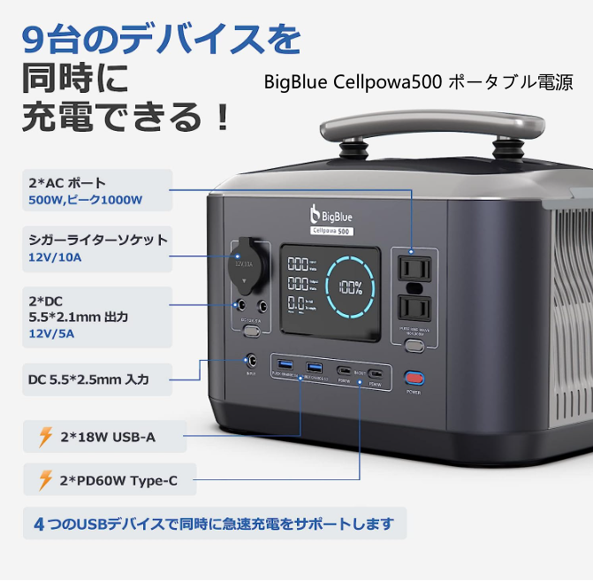 ◆BigBlue Cellpowa500 ポータブル電源 537.6Wh/168,000mAh 2時間80%充電できる