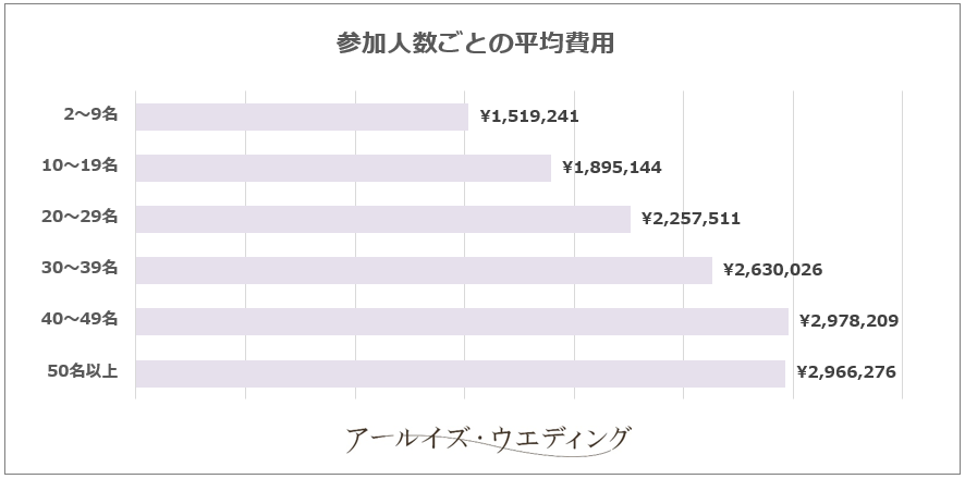 参加人数ごとの平均費用は以下の通りで、沖縄での結婚式の平均参加人数である14.5人の場合は平均費用が1,895,144円であることがわかります。人数が増えるごとに一人あたりの費用は安くなります。