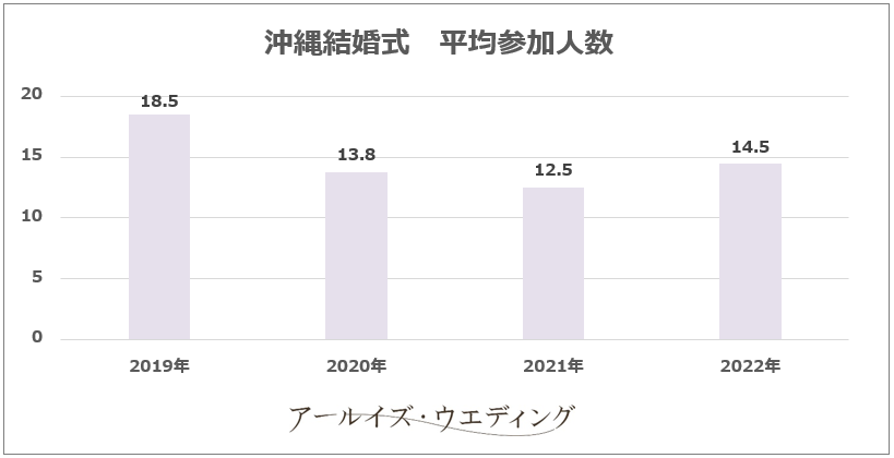 首都圏で結婚式と披露宴を執り行う場合の平均参加人数が44人*1の中、沖縄の結婚式に参加する人数は平均14.5人という結果になりました。コロナ禍で参加人数が減少していましたが、2022年より徐々に人数が増加傾向にあります。