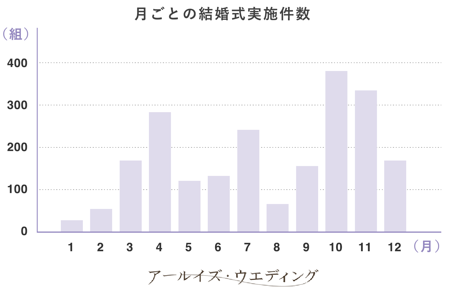 月ごとの結婚式実施件数の推移は以下グラフの通りで、比較的天候と旅費が落ち着く4月と10月、11月が人気のシーズンです。梅雨シーズンである5月・6月や台風シーズンである8月・9月は比較的落ち着く時期です。