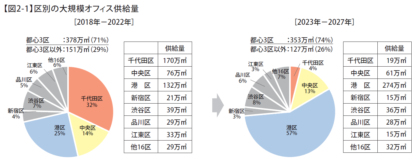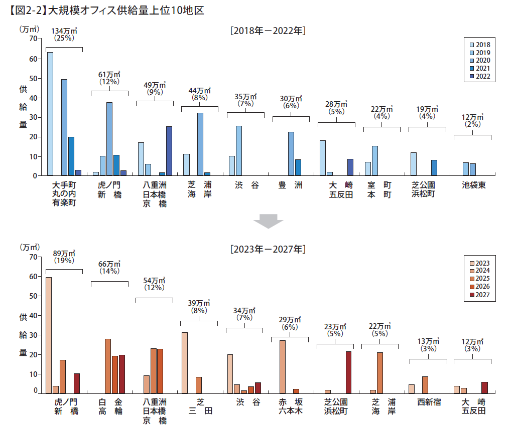 過去5年間と将来5年間の供給割合を区別に集計したところ、ともに都心3区の割合が7割を超えている。過去5年間では3割を占めた千代田区の割合が将来5年間では大幅に縮小し、港区の割合が倍増している。地区別に比較すると、過去5年間では供給量トップであった「大手町・丸の内・有楽町」が将来5年では圏外。将来5年間のランキングには「虎ノ門・新橋」「芝・三田」「赤坂・六本木」など、港区の6地区がランクインしている。