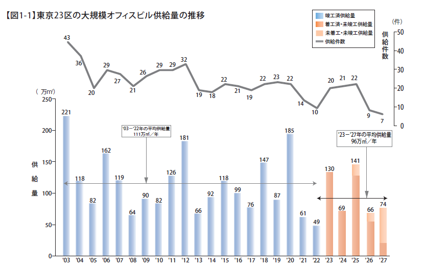 ’22年の大規模オフィスビルの供給量は49万㎡に留まり、過去20年で最も少ない供給量を2年連続で更新する。’23年は130万㎡、’25年は141万㎡と一定規模の供給があるが、’24年は69万㎡、’26年は66万㎡、’27年は74万㎡となり供給は絞られる。