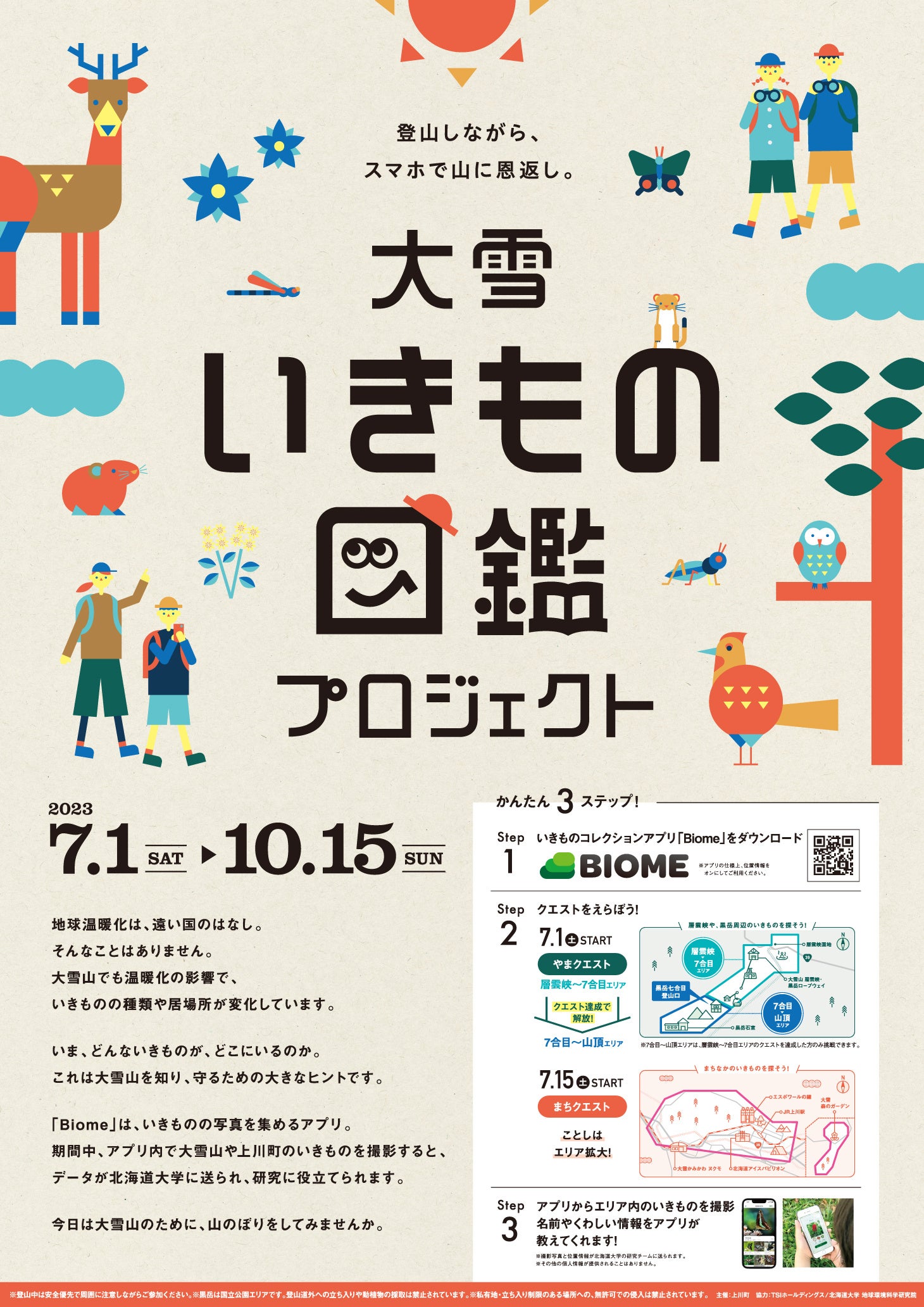 期間中、参加者の皆さんにはいきものコレクションアプリ「Biome(バイオーム)*1」をスマートフォンにダウンロードしていただき、アプリを立ち上げ、「クエスト」と呼ばれるゲーム機能を通して、楽しみながら大雪山や上川町に生息する生き物をアプリ上で撮影、収集していただきます。皆さんに収集していただいた生き物の生息域や数などのデータから、生き物の最新の生息分布状況を把握、可視化し、北海道大学 地球環境科学研究院における研究活動にも役立てていくことで、大雪山、上川周辺エリアの自然保護、再生に繋げていきます。(なお、絶滅危惧種等の希少種の位置情報についてはアプリ内で公開されることはありません。)