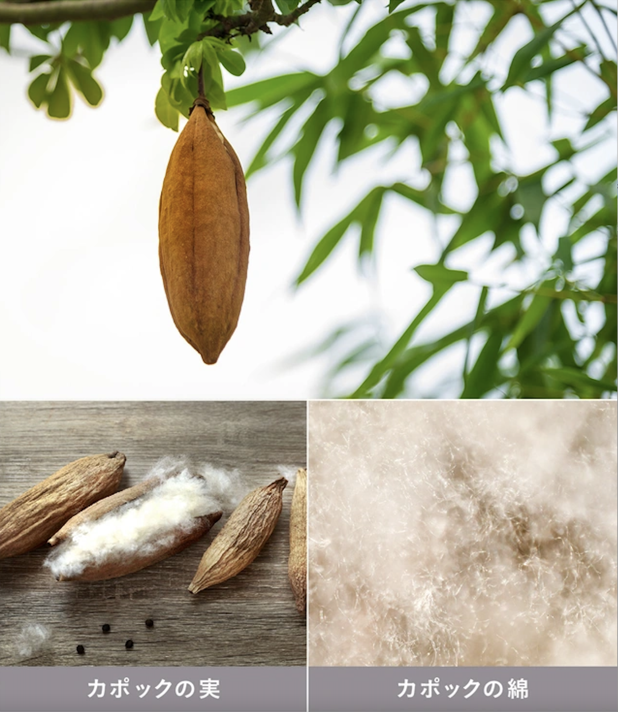 こちらのブランケット、マフラーは、天然由来である「カポック」という、とても軽く吸湿発熱性、保温性のある素材を用いた商品です。カポックは東南アジアの熱帯地方に自生しており、その実から沢山の綿が取れます。化学