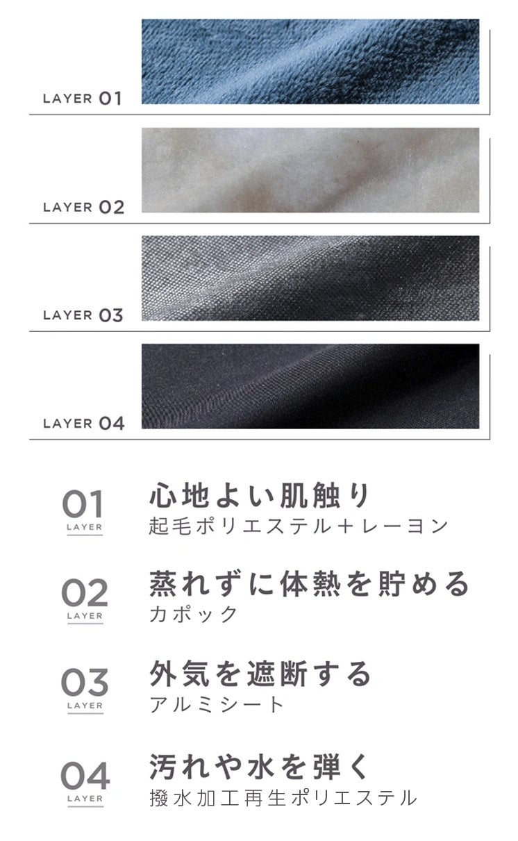 最近省エネの観点から注目されている裏付きカーテン構造から発想し、同じ多層構造にしています。生地と生地との間に空気層がうまれ保温性を高めています。肌面にふれる起毛素材のおかげで肌触りやさしく包み込んでくれます。