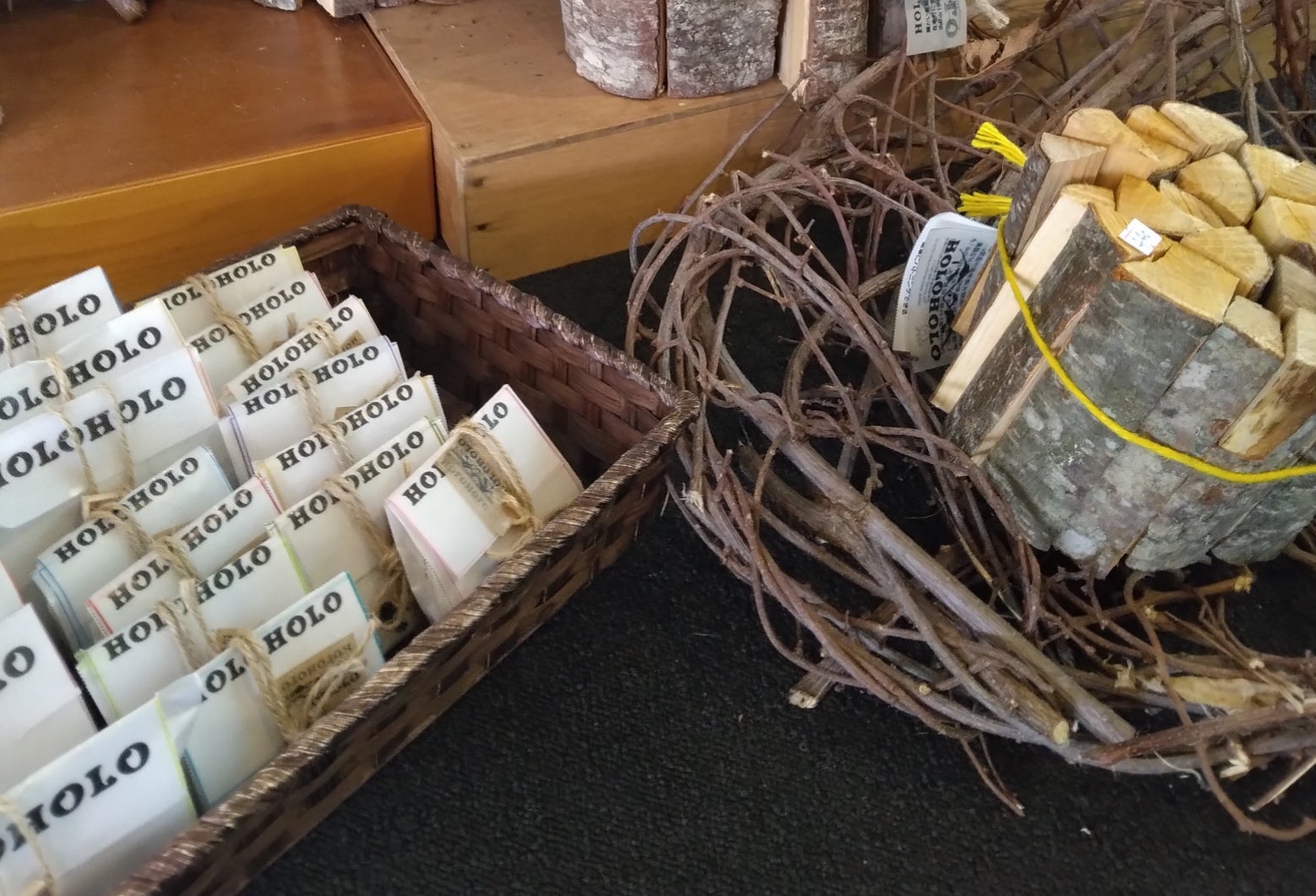 薪は麻の紐で束にして、タグにはロウ引きされた紙を使用しており、