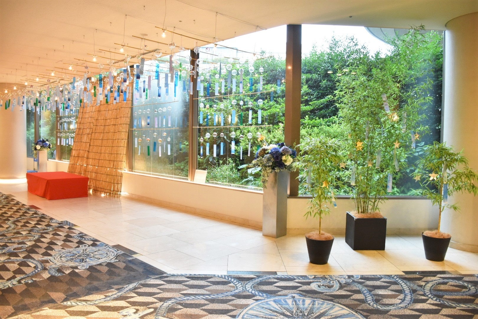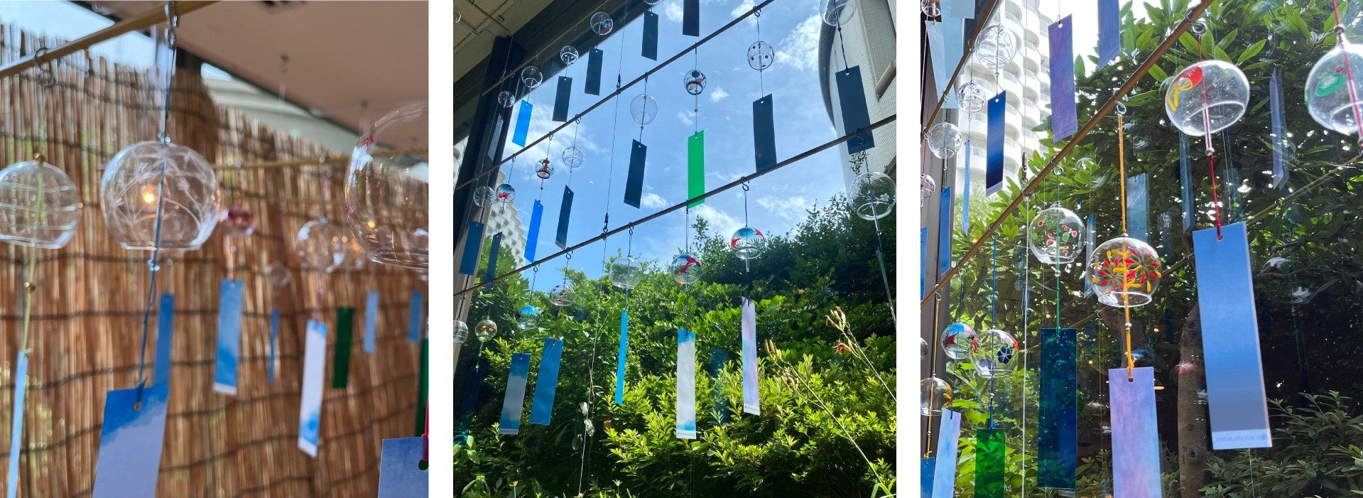 『風鈴コネクション』と題した本企画には、七夕の日に織姫と彦星が結ばれるように、「風鈴を通じて人と人とのご縁がつながりますように。」という願いが込められており、スタッフが一つ一つ丁寧に磨き上げた風鈴を飾りました。風鈴の下には、ポートピアホテルのイメージカラーでもあり、神戸の海・空を連想させるブルーを基調とした短冊を吊るし、ポートピアホテルらしい、涼しさ感じる夏を演出いたします。