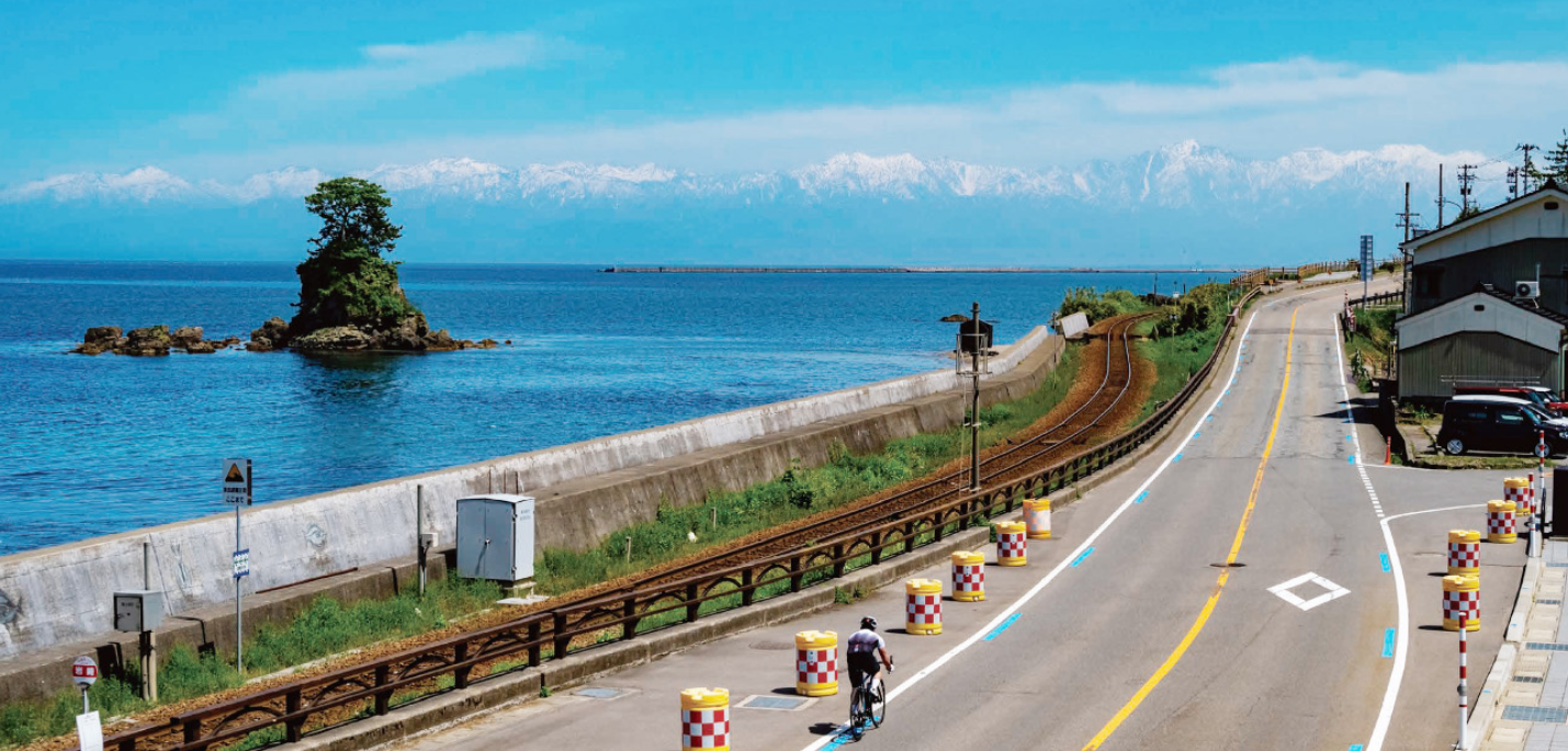 サイクリングコースが整備されています。国内外から富山県を訪れる方に、富山湾の美しい景色を楽しみながらサイクリングをしていただけるよう、湾岸沿いの眺望のよい道路をコースとして設定しています。