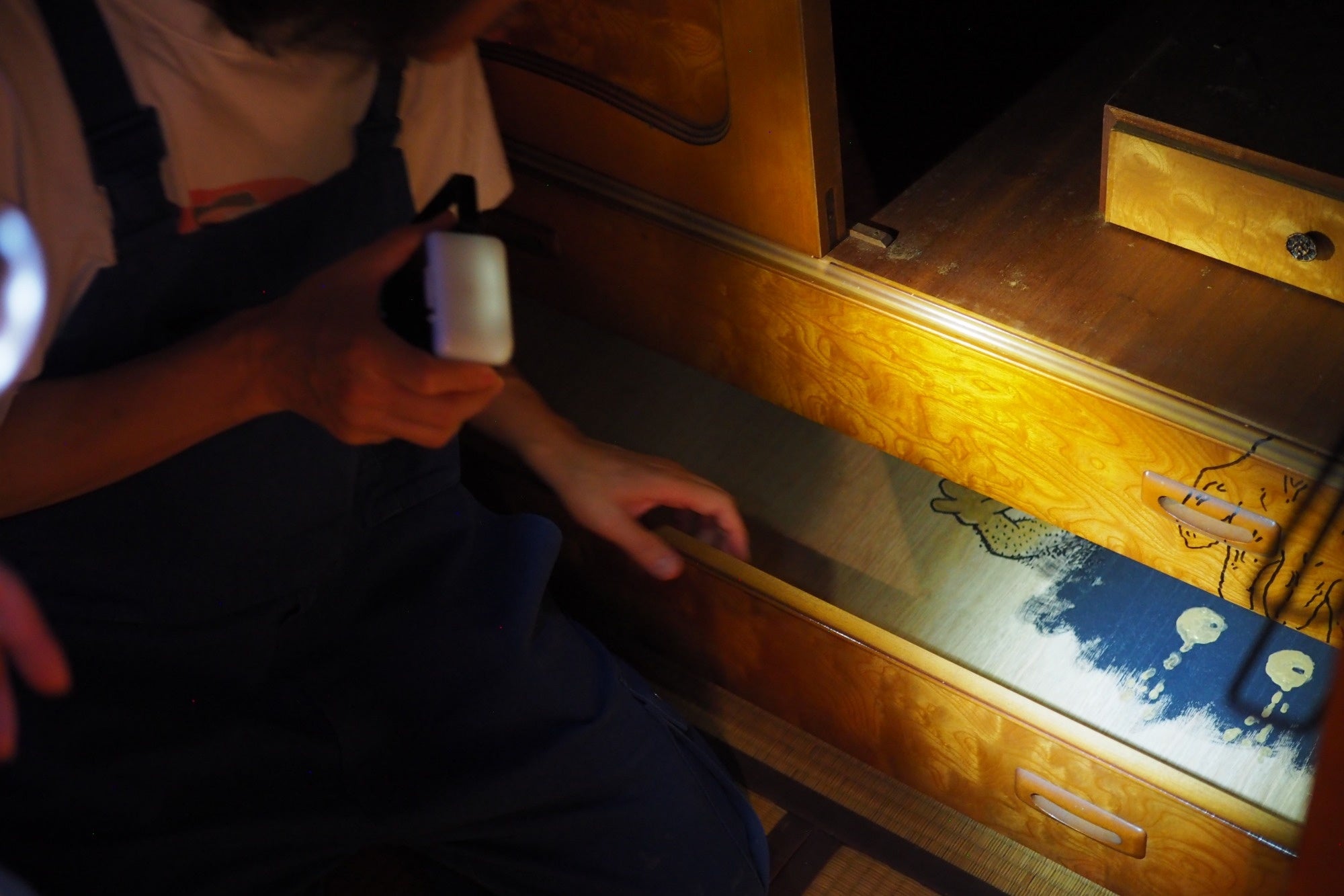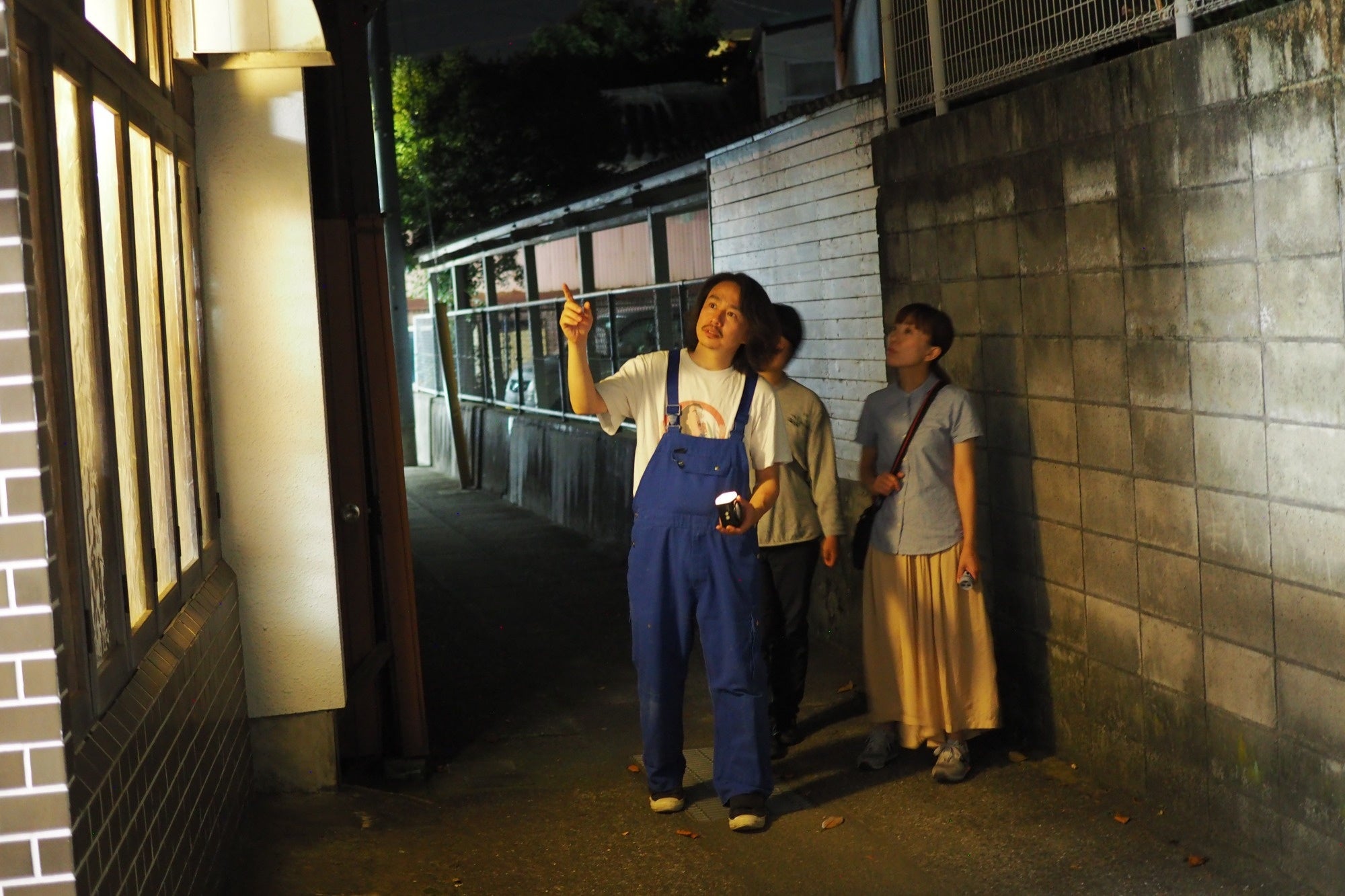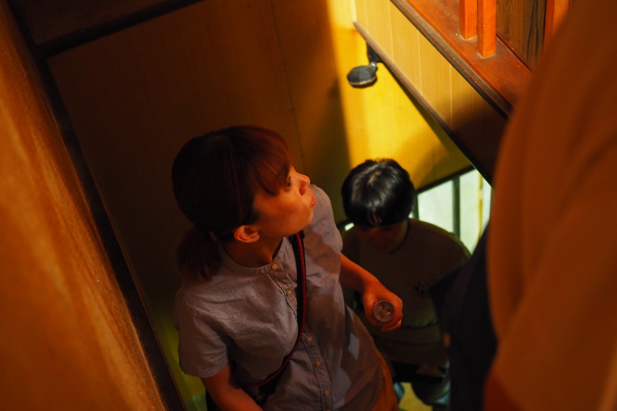 夜、妖怪美術館に集合したらスタッフが「迷路のまち」の路地を通って普段は開館していない「妖怪美術館5号館」へ案内。ここは2019年に台湾芸術大学の学生を招聘して妖怪アートのインスタレーションをしてもらった建物で、かつては「二葉食堂」という食堂兼住宅だったところです。2階の4室の壁、障子、家具などに妖怪画や造形作品が展示されています。作品を鑑賞しながら館内を進むと、何か不思議な出来事が起こるかもしれません。お化け屋敷ではなく、あくまでも美術館の鑑賞ツアーですので脅かしたりすることはありませんので、ご安心ください。