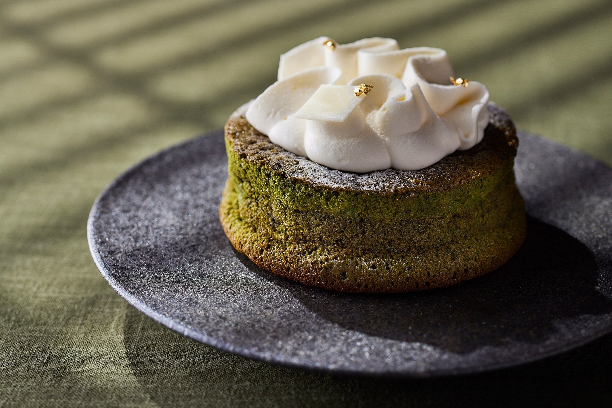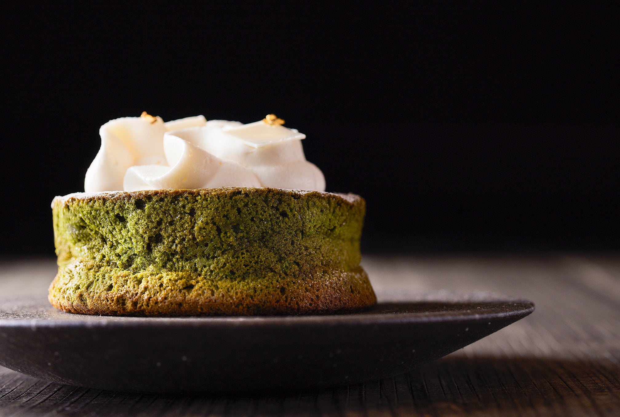 抹茶の風味・味わいをさらに生かすため、トッピングにもおとなの香りを…と考えました。バラ科の香りが合うと睨み、さくらんぼのリキュールを少量加え、香りがほのかに漂うホイップクリームを仕立てました。ケーキのほろ苦さとほんのり甘いクリームでおとなのマリアージュをお楽しみいただけます。