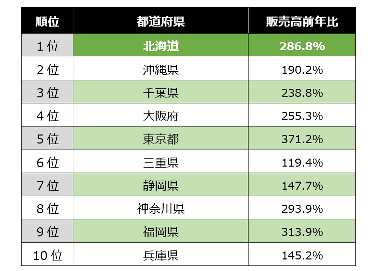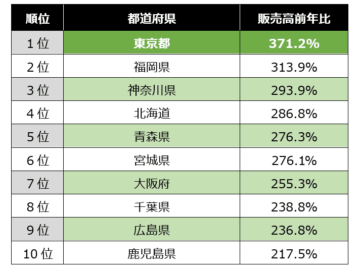 今年ならではなのが、5位の青森県。今年は「青森ねぶた祭」が4年ぶりに通常開催となることも影響し、青森県の販売高は前年比約2.8倍まで増加しました。