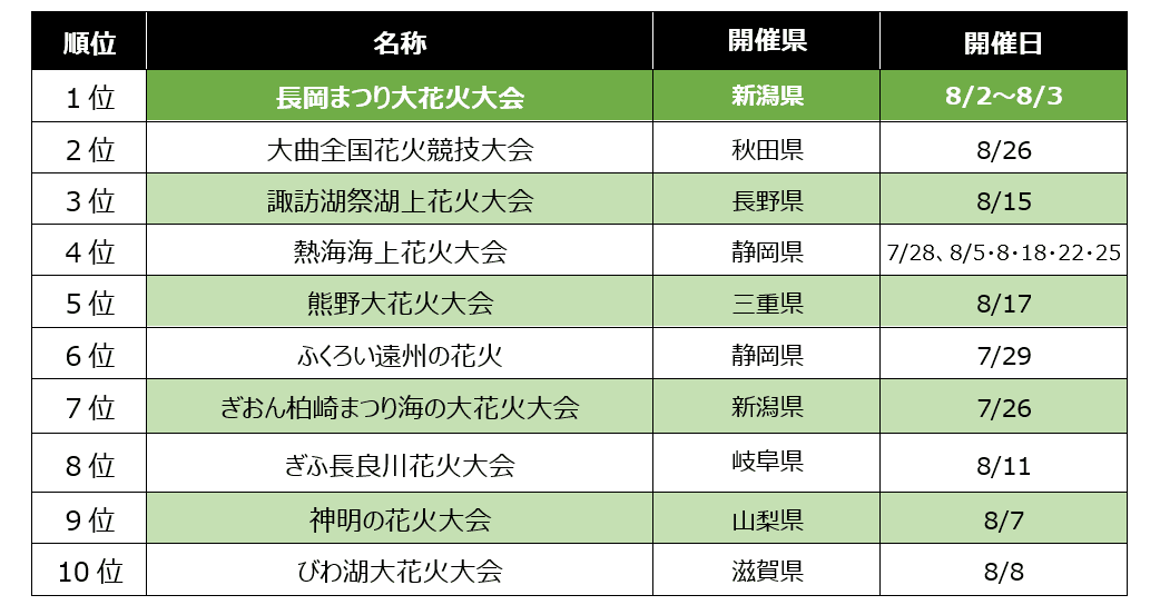 花火大会ランキングの1位を飾ったのが、新潟県「長岡まつり大花火大会」。今年は、アルコール飲料を含む飲食販売ブースの出店が再開に。そして2位の秋田県「大曲全国花火競技大会」は、座席の数や出店の制限は行わず、通常スタイルでの開催となります。そして、コロナ禍で中止や分散開催となっていた長野県「諏訪湖祭湖上花火大会」が4年ぶりに完全復活!第3位にランクインしています。