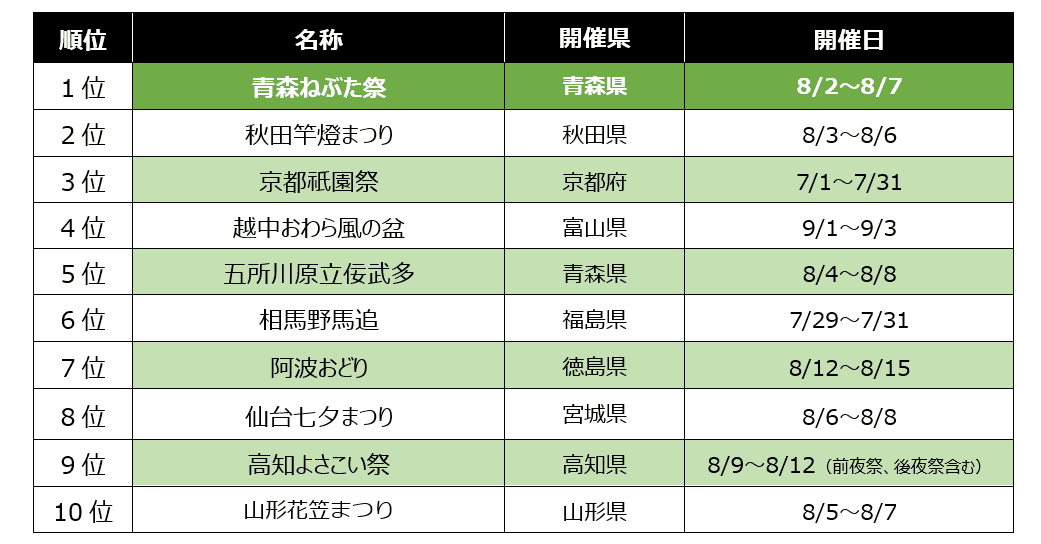 <「夏祭り」人気ランキング (クラブツーリズム)>