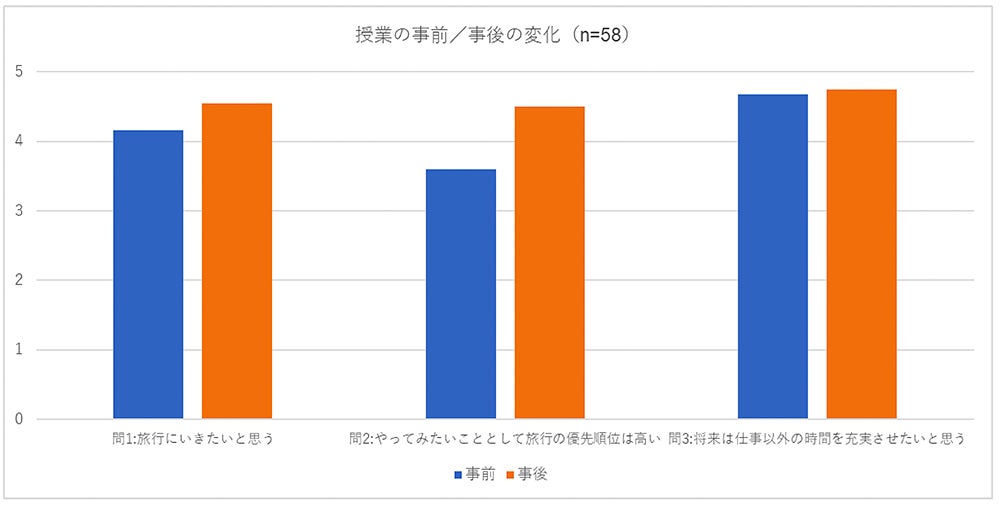 授業において、生徒たちにアンケートを行いました。「旅行に行きたいと思う」という質問に5段階で回答してもらった結果(※)、授業前は平均4.16点だったのに対し、授業後は4.55点となり、旅行意向が増したことが分かりました。さらに、「やってみたいこととして旅行の優先順位は高い」という質問に対しては、授業前は平均3.6点だったものが、授業後は4.5点に増加しました。また、「将来は仕事以外の時間を充実させたいと思う」という質問に対しては、授業前は平均4.68点だったものが、授業後は4.75点となりました。生徒からは「自分が思っている好みとはまったく別の結果で驚きました。結果を見ると、確かに自分の行きたい旅行の種類だったと思いました」「好きなことから自分に合っている旅行が見つけ出せて楽しかった。あまり旅行に行くことがないので、これからたくさん行きたいと思った」「将来仕事以外の余暇も充実させるようにしたいです」などの声があり、授業に参加したことでキャリアにおける余暇の大切さや旅行への意欲が高まり、選択肢が広がった様子がうかがえます。