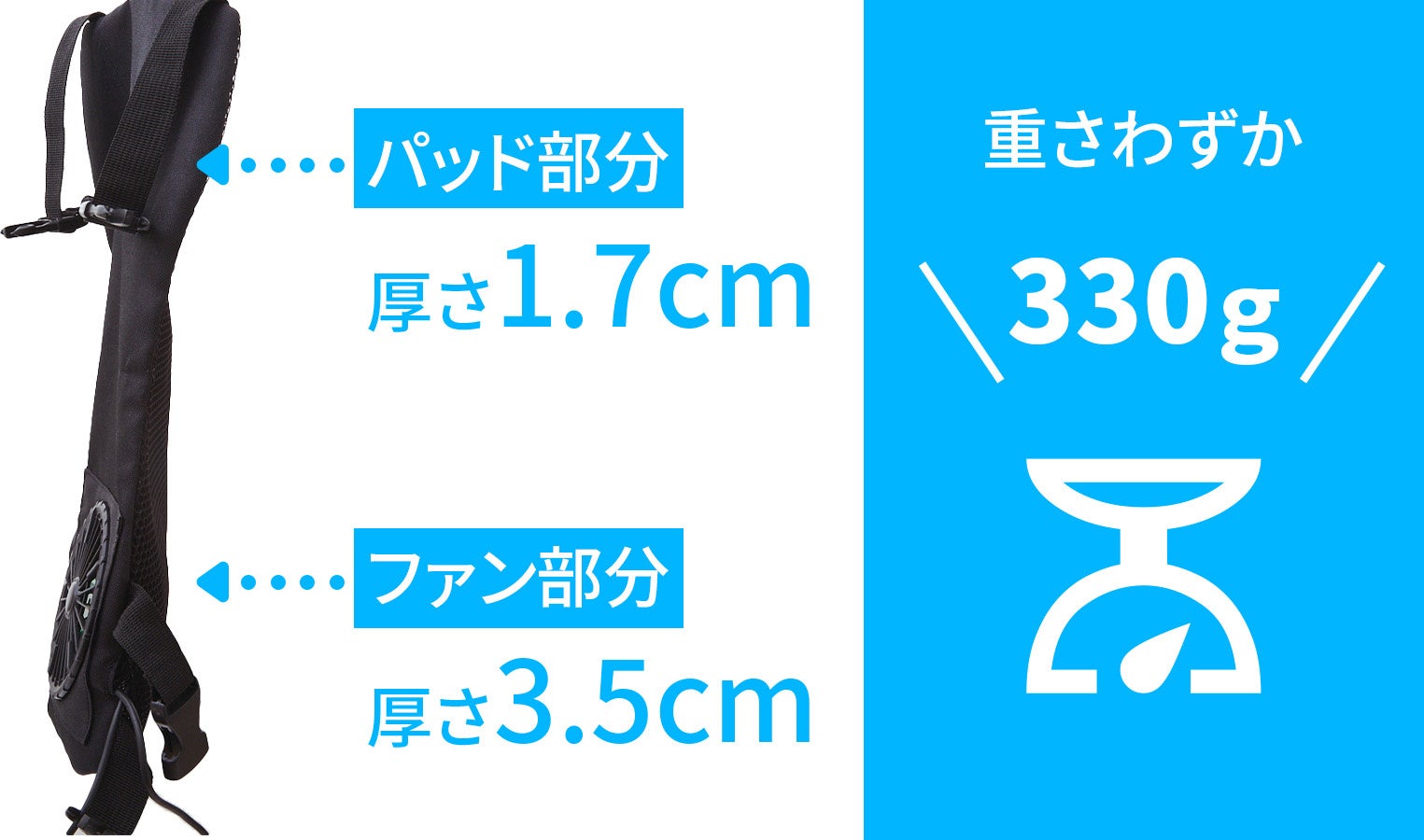 わずか330gを普段お使いのリュックにプラスするだけで、ハンディファンなどと違ってとハンズフリーで背中部分が涼しいリュックに変身します!