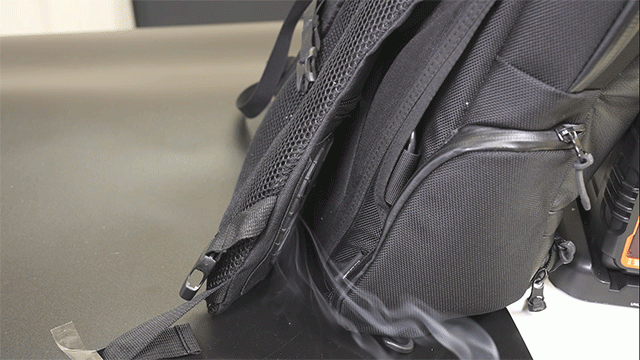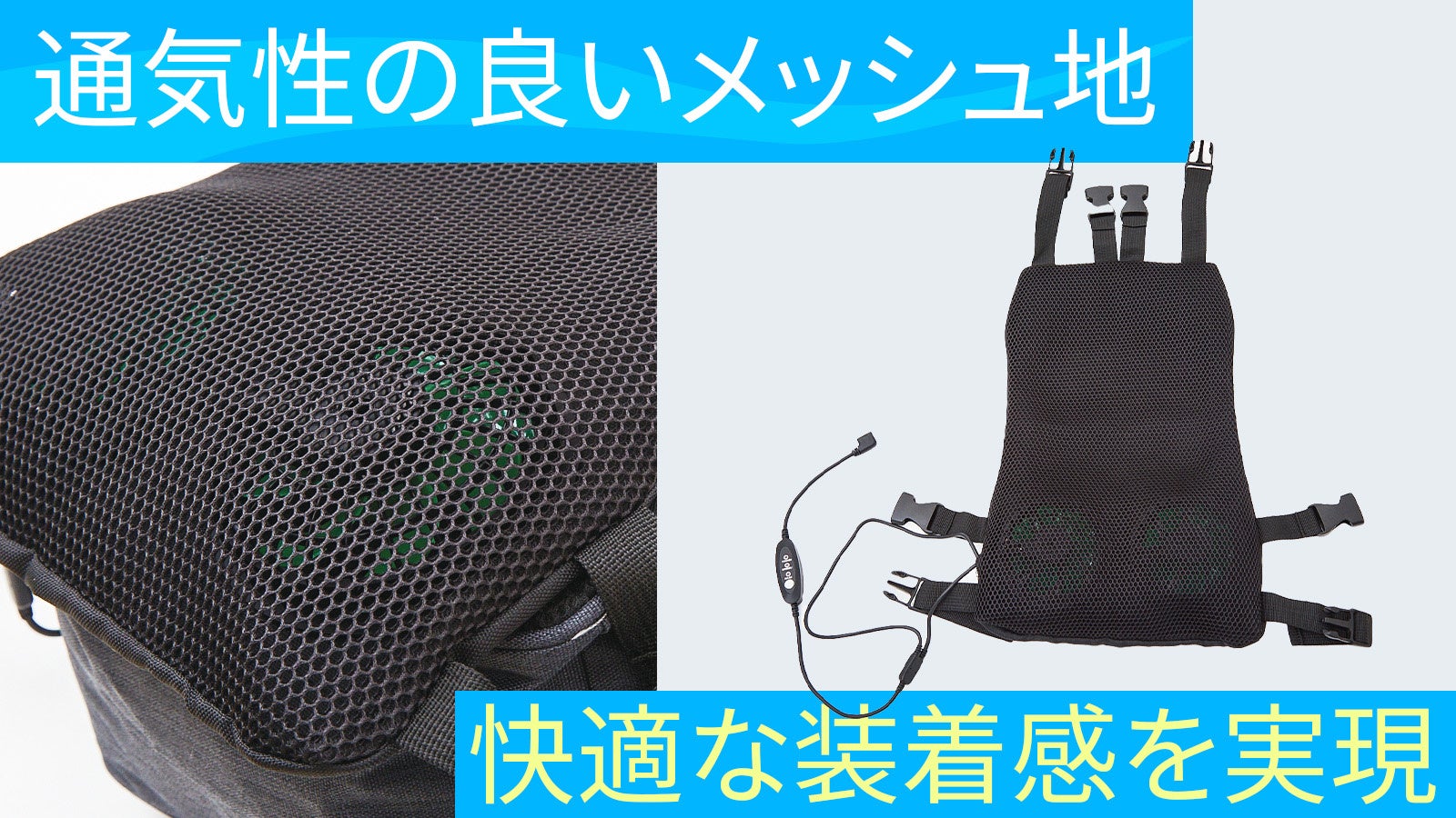 パッド全体に通気性の良いメッシュ素材を採用し、背中とリュックの間に風が通りやすい構造となっています。ファンから送られた空気が背中全体へ効率よく行き届きます。