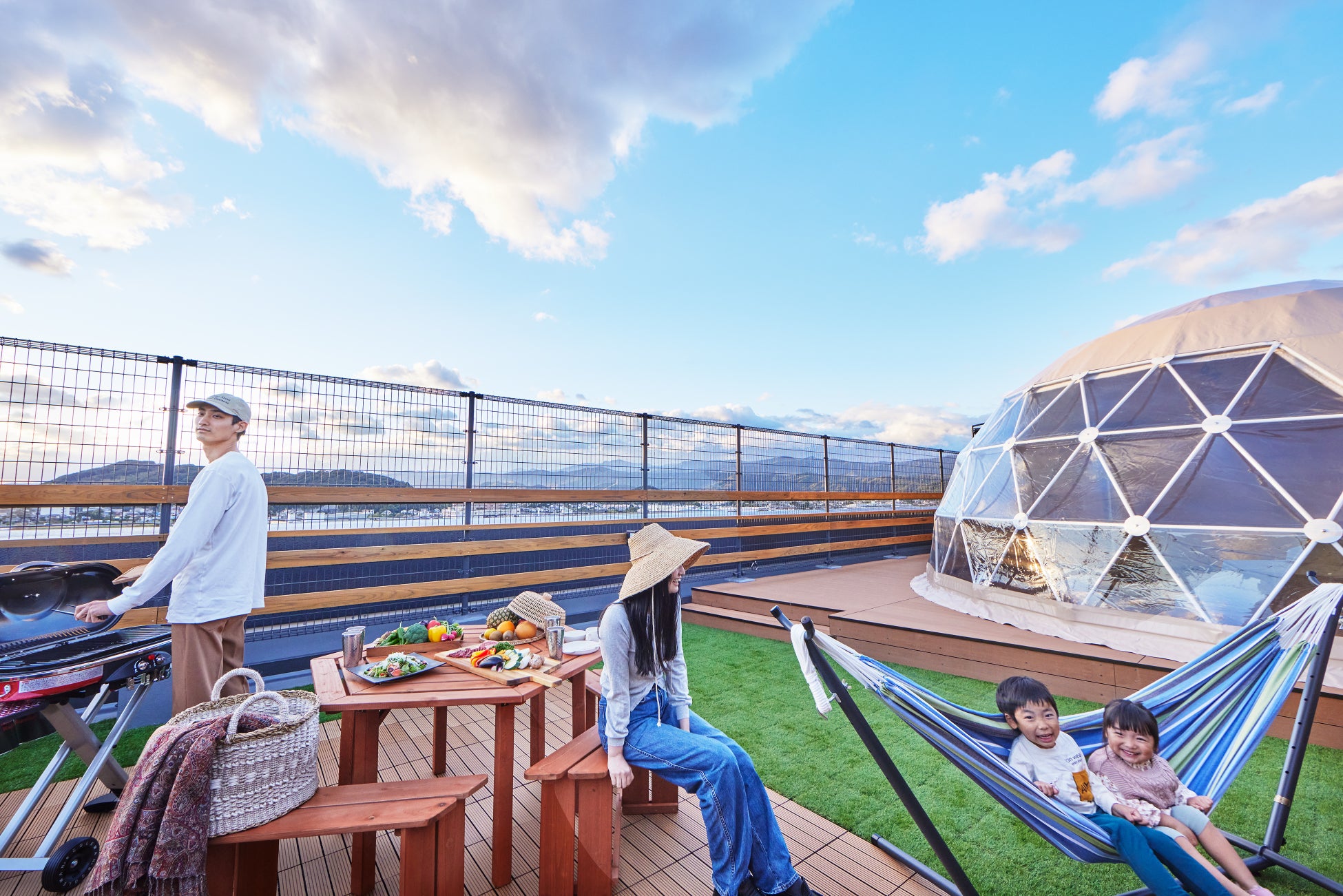高知の街々を見渡すサザンシティホテルの屋上に、ご家族やご友人とゆっくりお過ごしいただけるグランピングエリアがオープン。高知駅より車20分/高知空港より10分の好アクセス地で、気軽にアウトドア体験をお楽しみいただけます。