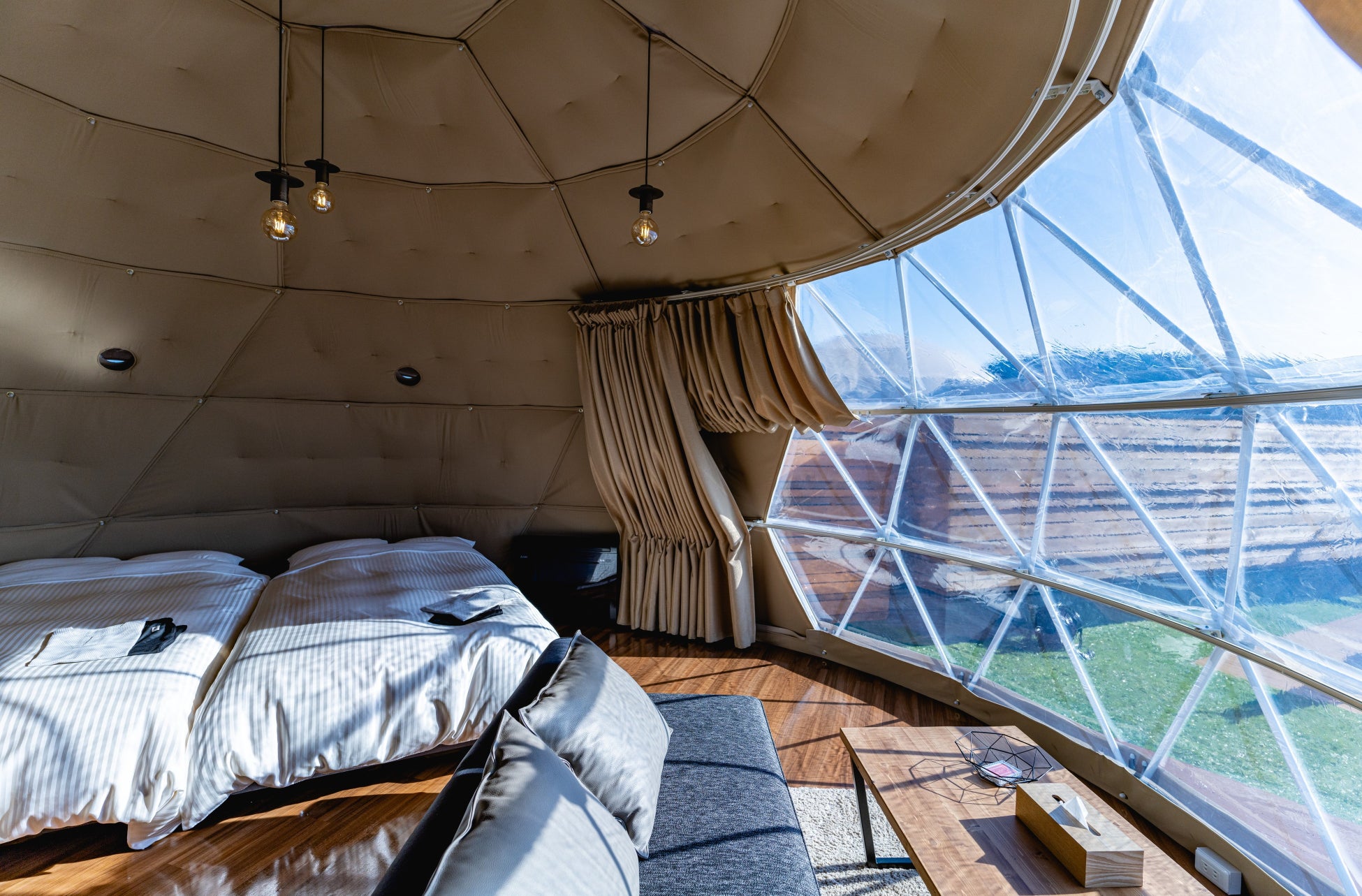 直径6mの大型ドームテント内に快適な宿泊設備をご用意。ドームの外に広がる夜空を背景に、ホテルルームでの宿泊とは一味違う、非日常空間でのご宿泊体験を。