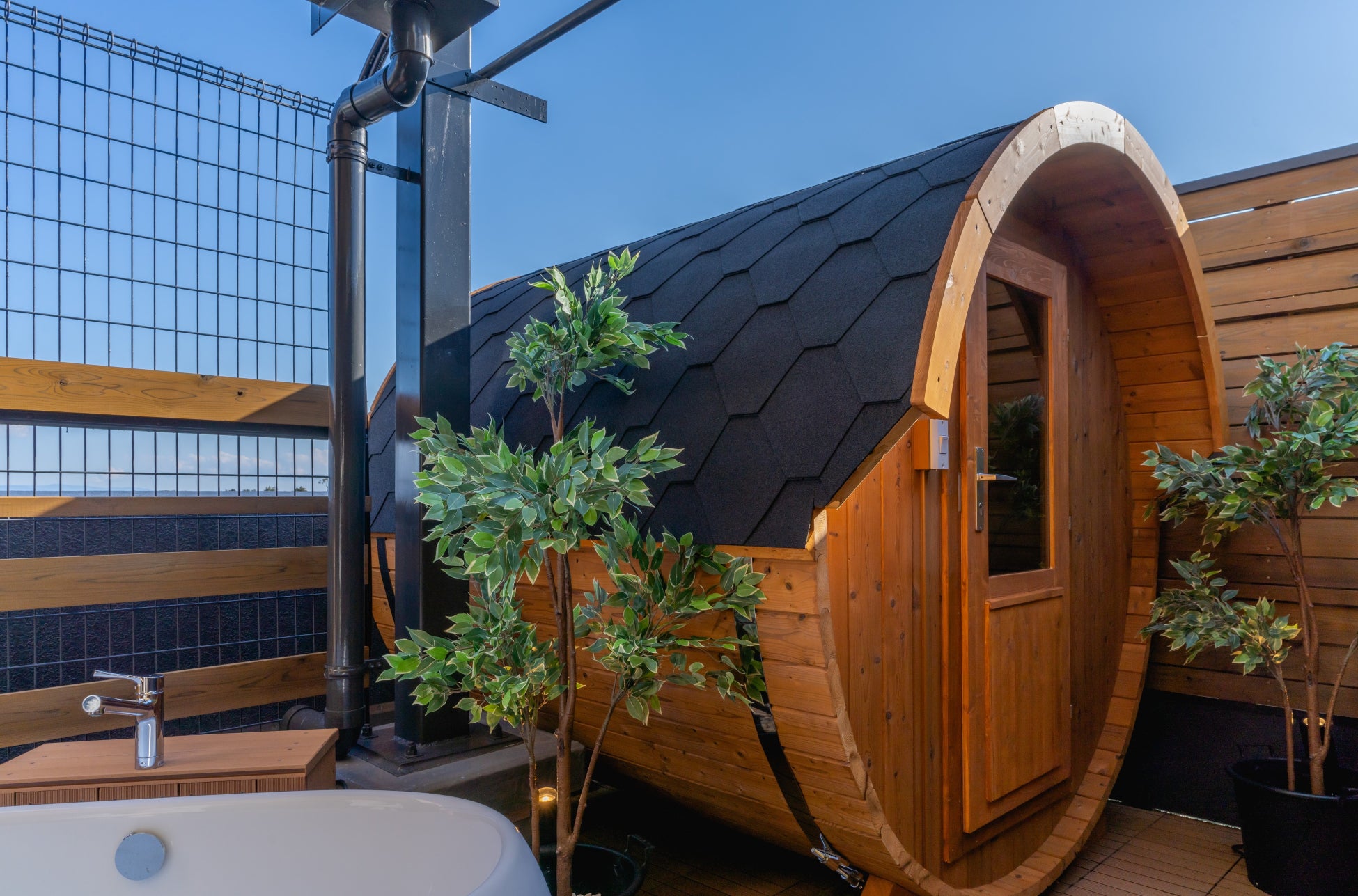 ルーフトップグランピング高知には、時間制貸切でお使いいただけるバレルサウナと露天風呂のご用意をしております。夜景や星空の下での外気浴や“ととのう”体験はここでしか体験できない時間。貸切利用時間は2種類をご用意しておりますので宿泊スタイルに合った時間でお選びいただけます。