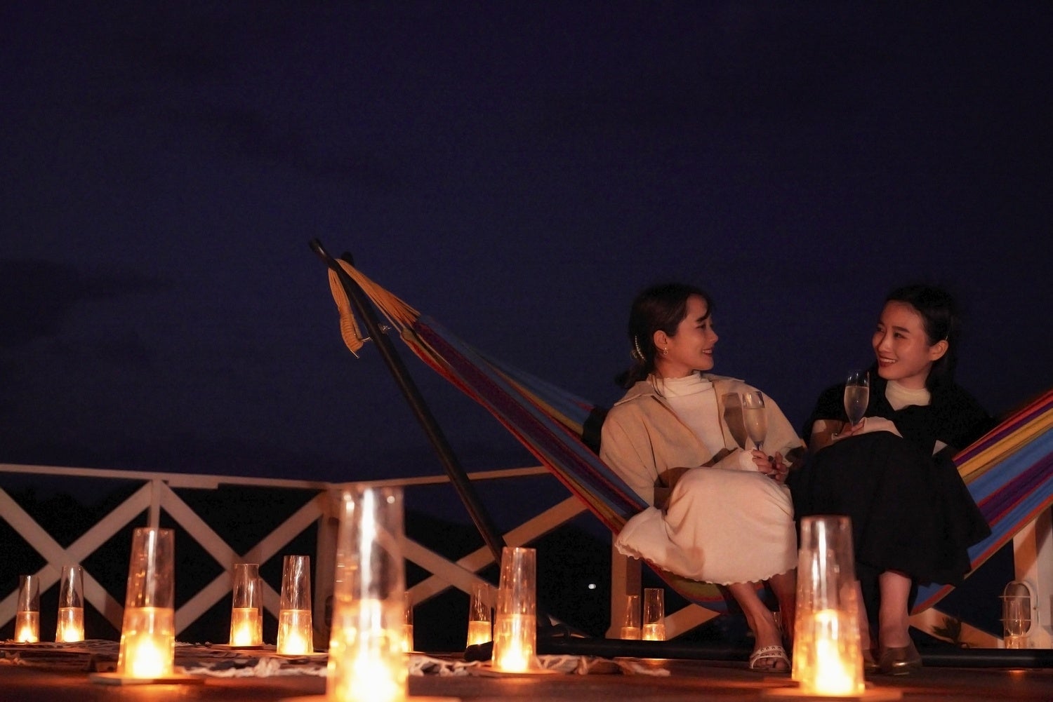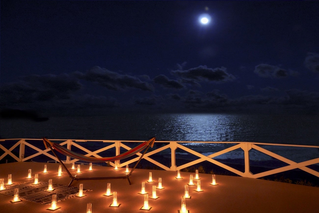 下田プリンスホテルが持つ絶景、それは何といってもオーシャンフロントの立地がもたらす、まるでプライベートビーチのような大迫力の海と美しい白い砂浜です。今回はその絶景をさらに楽しんでいただくため、宿泊プランとして「自然が灯す、ムーンライトリトリート」を提供いたします。静寂の闇夜に浮かぶ月の光景や海面へと伸びる柔らかな月明かりの道は、月見に適した季節と言われる秋だからこその幻想的な風景。テラスに設置されたハンモックに身を預けながら、月明かりに照らされた海面の揺らぎやキャンドルの灯りの輝きに包まれてくつろぐことができます。さらに、洋上をゆっくりと行き交う船舶の明かりも時間の経過を感じさせるアクセントとなり、贅沢なひとときを演出してくれます。1日に1組限定のご利用となりますので、プライベートな空間で絶景をご堪能ください。