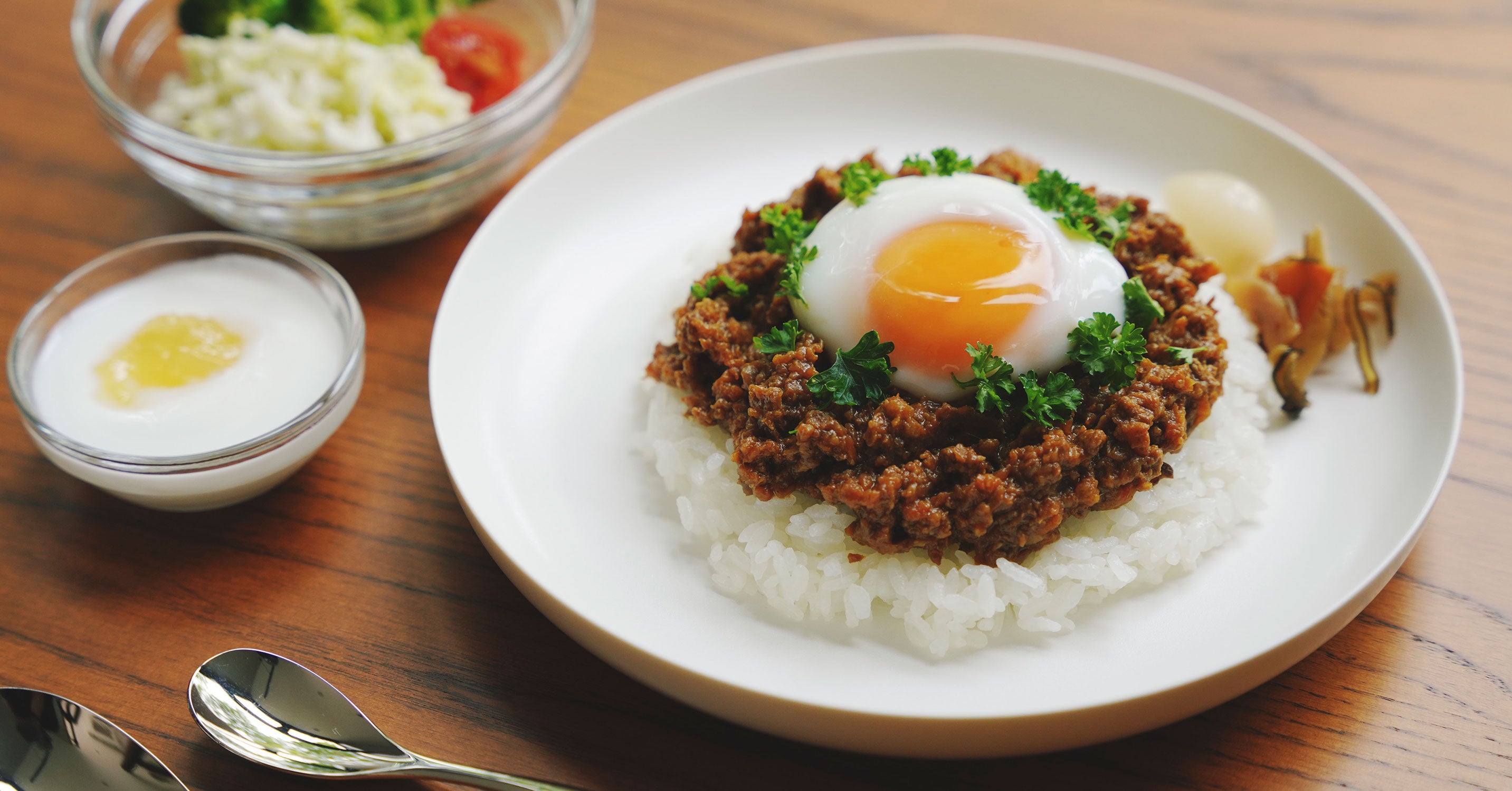 国産牛の中挽き肉と人参・玉ねぎ・キノコをたっぷり入れた中辛キーマカレー。温泉卵と混ぜながらお召し上がりいただくと辛さと甘さがお口の中に広がります。 甘口は豚肉と野菜の甘みを活かしました。お子様も召し上がれます。