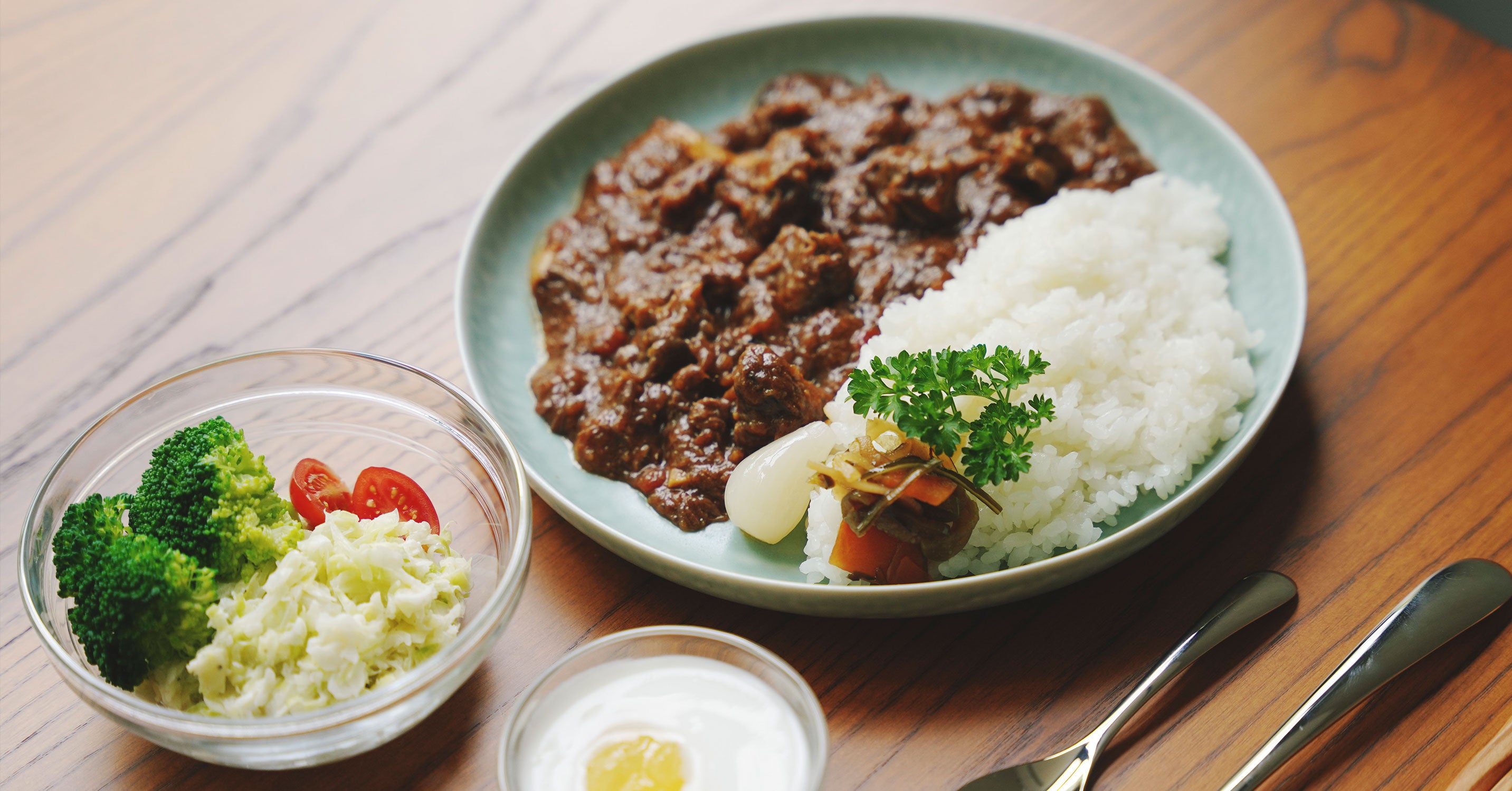国産A5クラス黒毛和牛と、玉ねぎや信州産リンゴ・キノコを使い、スパイスでしっかり煮込んだ中辛のビーフカレーです。食べ始めはトマトの酸味を感じ、その後甘さ、辛さと続く、奥深い仕上がりになっています。水は一切入れず、果物や野菜の水分のみで作っています。