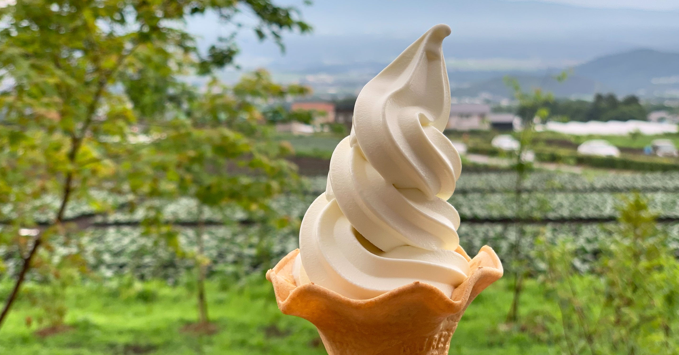 白樺高原 長門牧場のソフトクリームです。牧場ならではの濃厚でミルキーな味わいが特徴です。ソフトクリームを使用したあんみつ、アフォガードなどもおすすめです。